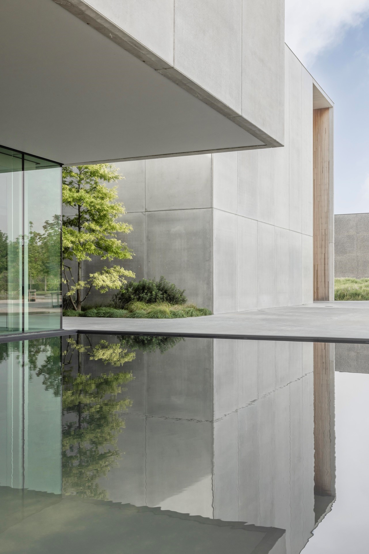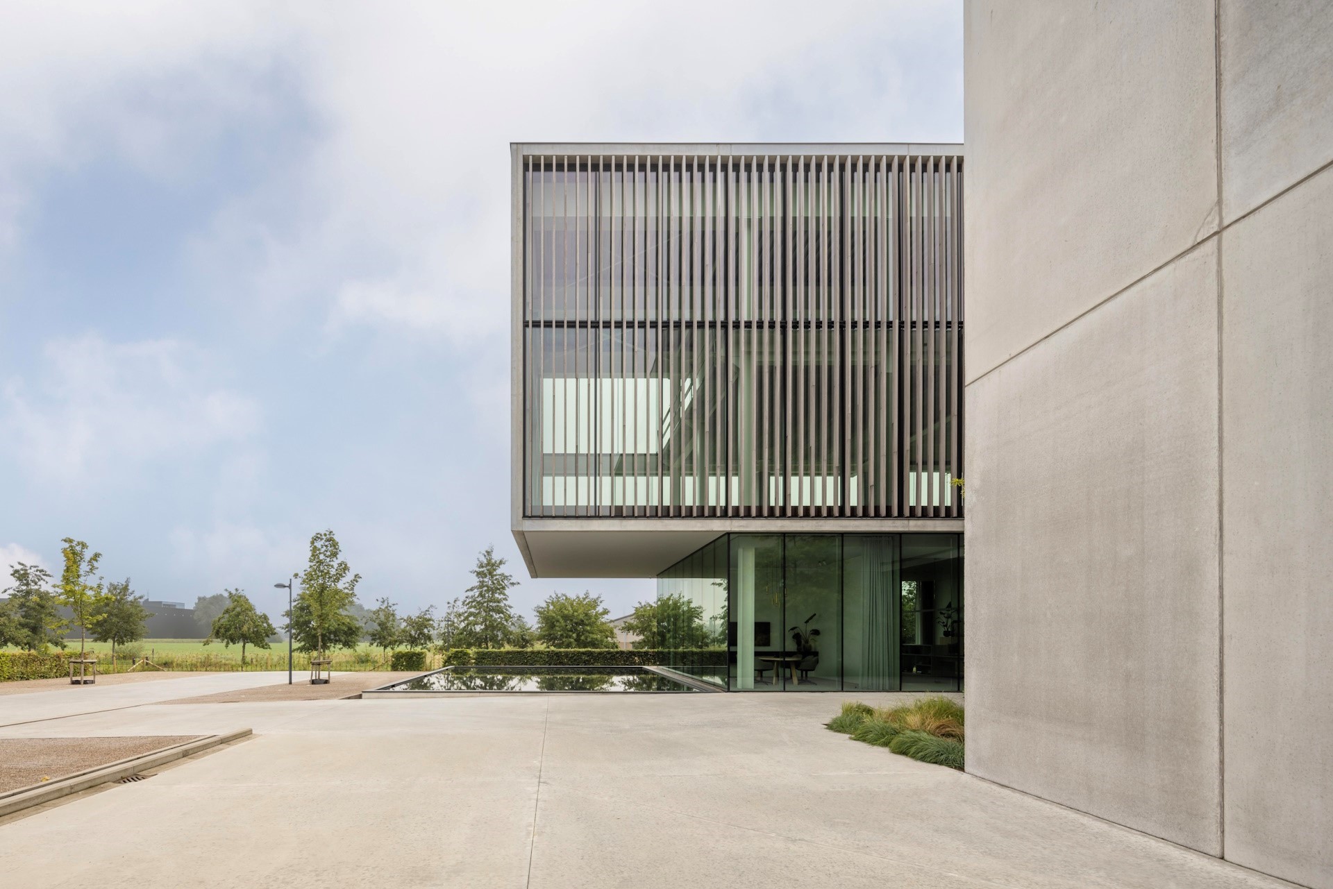 Het ontwerp, van de hand van Govaert & Vanhoutte Architects, is bijzonder en op zijn minst atypisch te noemen voor een bedrijvenzone. “Wanneer geprefabriceerde betonnen gevelpanelen worden toegepast voor loodsen of kantoorgebouwen in een industriezone, dan zijn het doorgaans horizontale panelen in gewoon, glad beton”, vertelt Damiaan Vanhoutte. “Dat is weinig origineel en bovendien onderhevig aan verkleuring. Daarom kozen wij voor panelen in glad, wit beton én opteerden we voor een verticale plaatsing, wat het ontwerp er op de site meteen doet uitspringen.”