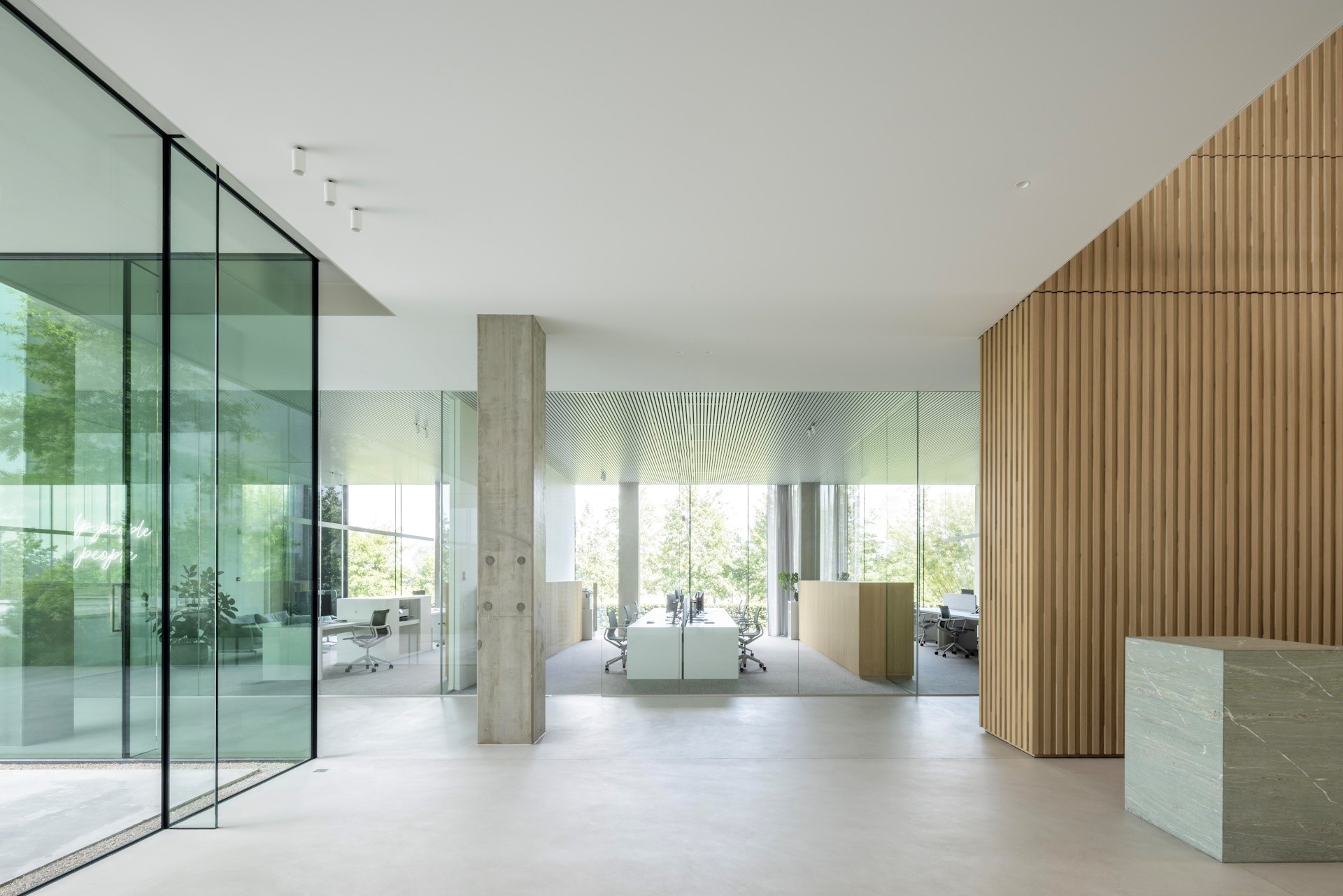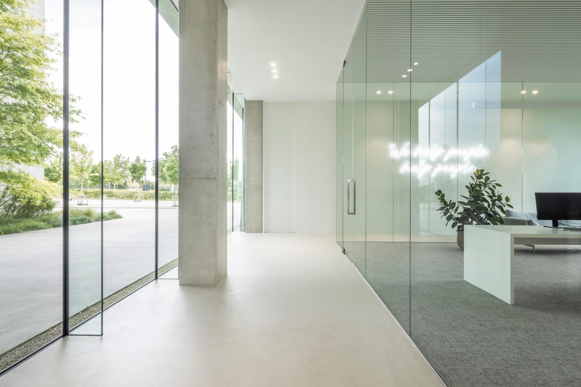 En snelheid haalt ook Damiaan Vanhoutte aan als een van de grote voordelen. “Zeker voor bedrijfsgebouwen, kantoren, loodsen … is prefab beton uitermate geschikt omwille van de snelle bouwtijd. En binnen dat verhaal denken wij graag ruimer, vandaar de keuze voor de verticaliteit en wit, glad beton. Dit maakt het misschien iets duurder, maar niet veel. De meerkost weegt niet op tegen de architecturale en visuele meerwaarde. En het resultaat wordt zeker gesmaakt. In eerste instantie door de klant zelf, maar ook Stad Kortrijk stimuleert mooie architectuur in bedrijvenzones. Niet alleen de buitenkant, maar ook de binnenkant spreekt tot de verbeelding. Zo is de inkomhal opengetrokken over twee verdiepingen, wat voor een directe ruimtelijke link zorgt met de grote loods die zich rechts van de inkom bevindt. Aan de linkerkant werden de kantoren ondergebracht. Het geheel, zowel binnen- als buitenkant, straalt een zekere klasse uit. Een klasse en kwaliteit die ook Novitan als prominente farmaceutische speler beoogt”