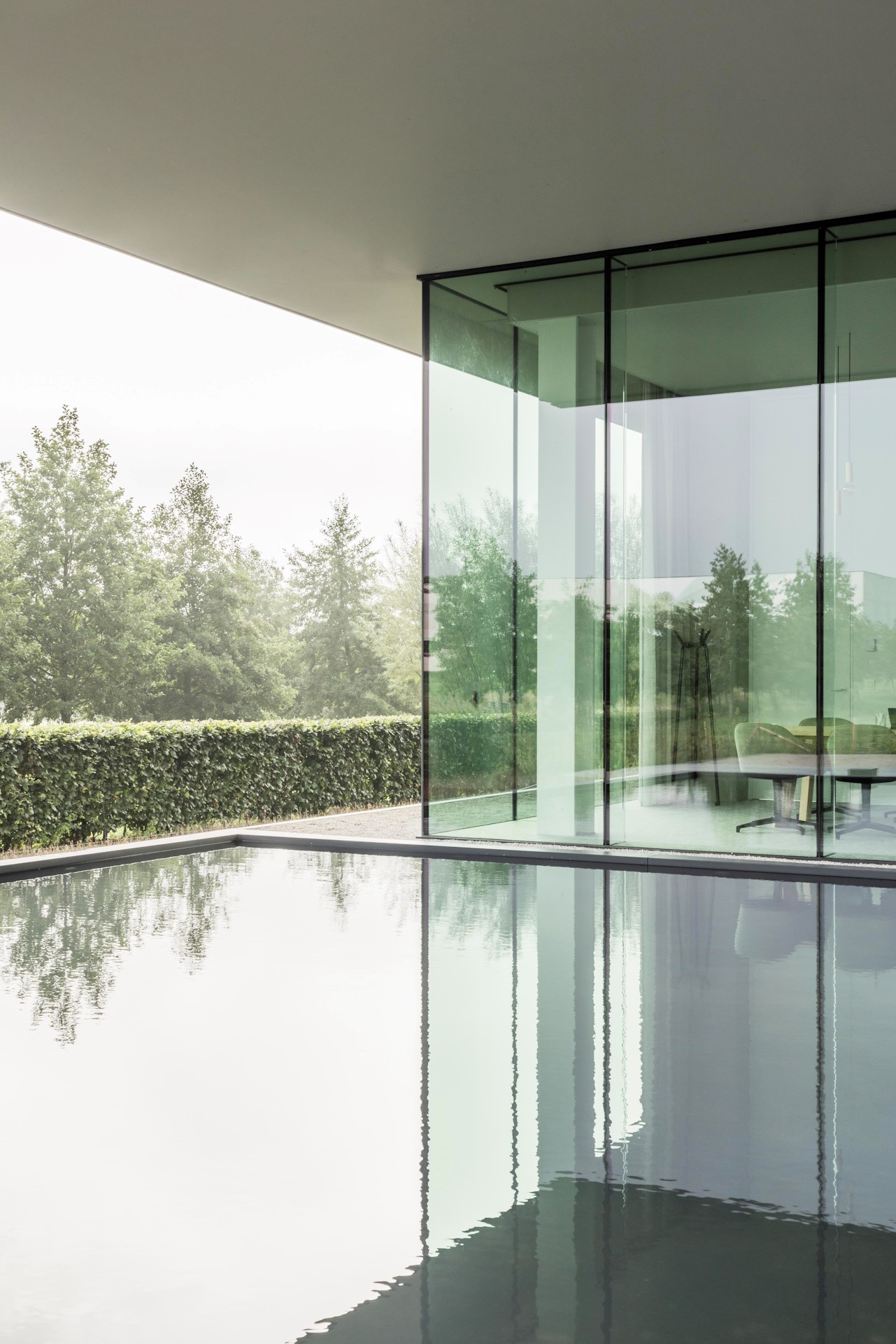 De uitkragingen van het kantoorgebouw over een kleine vijver aan de zijgevel bezorgden de studieafdeling van Valcke Prefab Beton extra denkwerk. Uiteindelijk werd voor die zones gekozen om de betonstructuur te combineren met een staalstructuur, om enerzijds het gewenste strakke uiterlijk en anderzijds voldoende draagkracht te garanderen. Clément Decroix: “De overkraging over de vijver is zes meter en daar kwam heel wat rekenwerk bij kijken. Aangezien het vloerpakket van de eerste verdiepingen niet te dik mocht zijn, werd gekozen om daar te werken met een staalconstructie. Op dat punt wordt eigenlijk staal gekoppeld aan beton, zodat we die overkraging konden uitvoeren, met behoud van een slanke constructie.”