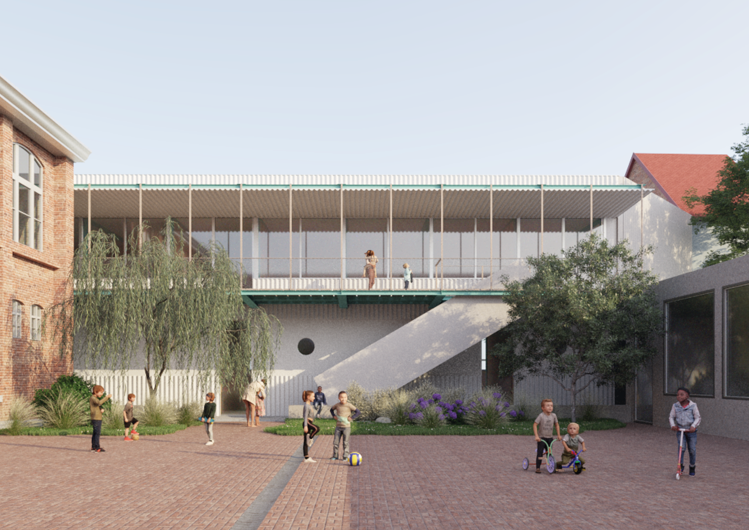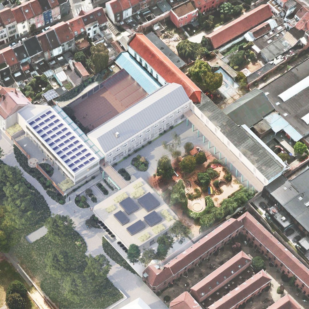 Het resultaat is een gebouw dat zich niet opdringt, maar wel een nieuw hoofdstuk toevoegt aan de geschiedenis van de site. De kinderdagverblijfvolumes passen qua schaal en positionering in het stedelijk weefsel, en vormen tegelijk een schakel tussen de interne schoolwerking en de publieke ruimte van de buurt. Het ontwerp laat ruimte voor toekomstig gebruik, biedt robuuste oplossingen voor tijdelijke noden, en draagt op een slimme manier bij aan de geleidelijke herontwikkeling van het hele bouwblok.