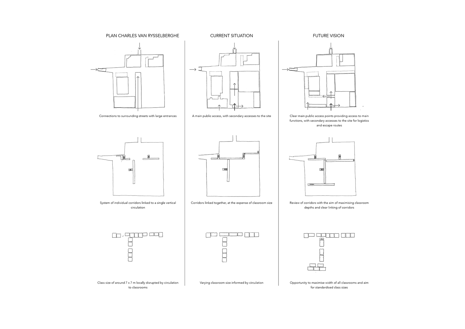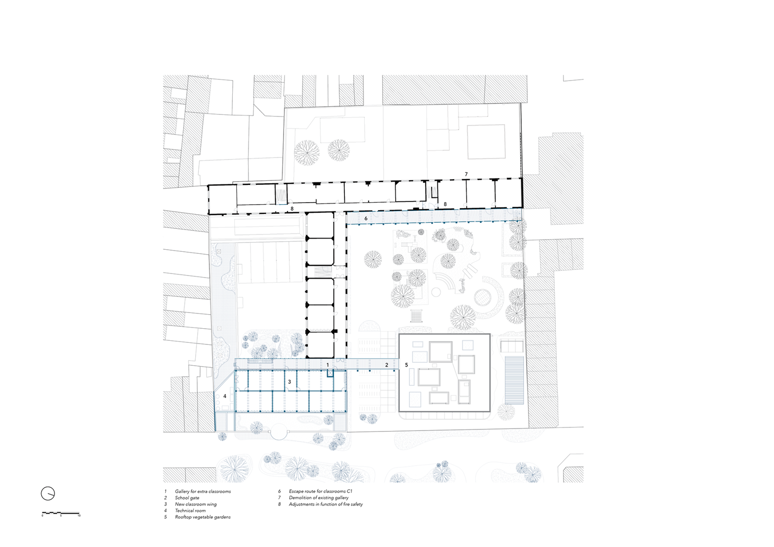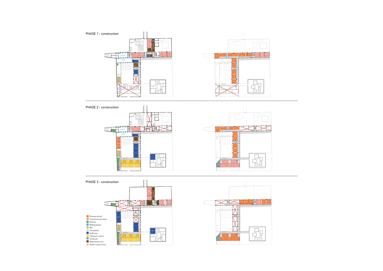 De nieuwe gebouwen bieden niet alleen fysieke ruimte voor jonge kinderen, maar herstructureren ook de werking van de school. Administratieve functies van de school en het kinderdagverblijf worden samengebracht in het bestaande schoolgebouw, dat daardoor efficiënter en overzichtelijker functioneert. Op de verdieping boven de crèche voorziet het ontwerpteam een flexibele ruimte, die tijdens de renovatiefasen dienst kan doen als klaslokaal of ontmoetingsruimte, en op lange termijn plaats biedt aan pedagogische vernieuwing binnen het Freinetonderwijs.