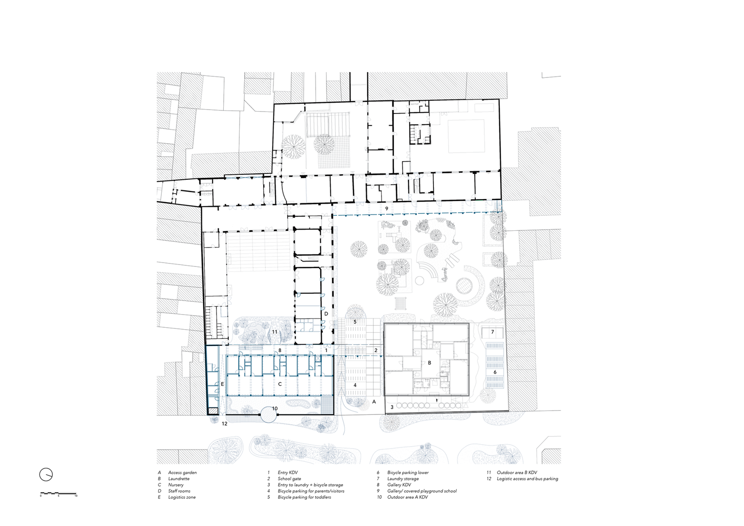 Het project kadert in een bredere hertekening van de schoolsite, die in drie fasen wordt aangepakt. De nieuwbouw voor het kinderdagverblijf vormt niet alleen een belangrijke eerste stap, maar is ook het vehikel waarmee het ontwerpteam het bredere masterplan op intelligente wijze helpt realiseren. De architecten grijpen deze gelegenheid aan om de werking van de school te optimaliseren, tijdelijke verhuisoperaties te beperken en een ruimtelijk kader te bieden voor toekomstige onderwijsontwikkelingen.