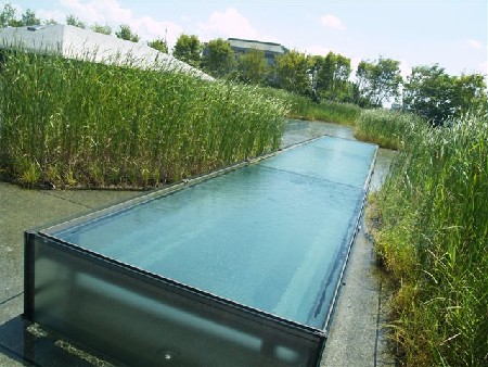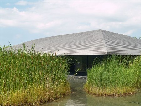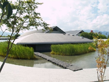 Het Sagawa Art Museum, met trein en bus 1,5 u. ten noorden van Kyoto, drijft op een vijvervlak.