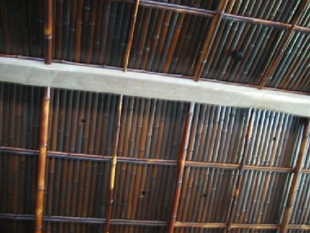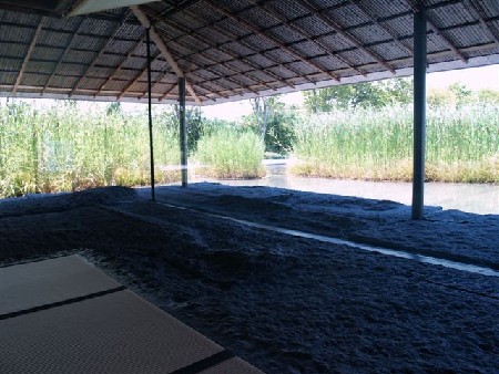 Zit op de tatami en kijk naar het plafond in bamboe van honderden jaren oud, naar het riet in de omringende vijver, naar de massieve blok met zuiverend water,... Binnen en buiten vloeien onzichtbaar in elkaar.