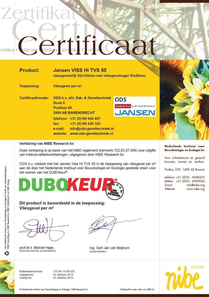 ODS en Jansen hebben drie stalen systemen van Jansen laten onderwerpen aan een levenscyclusanalyse door het Nederlandse Instituut voor Bouwbiologie en Ecologie (NIBE). Resultaat: binnen het door NIBE gehanteerde klassensysteem komen de VISS TVS HI vliesgevels in staal als beste keuze naar voren met de laagste schaduwkosten (het minst milieu belastend). Volgens de NIBE Milieuclassificaties Bouwproducten 2015 behaalt Jansen VISS Milieuklasse 1a met de laagste schaduwkosten in de markt.