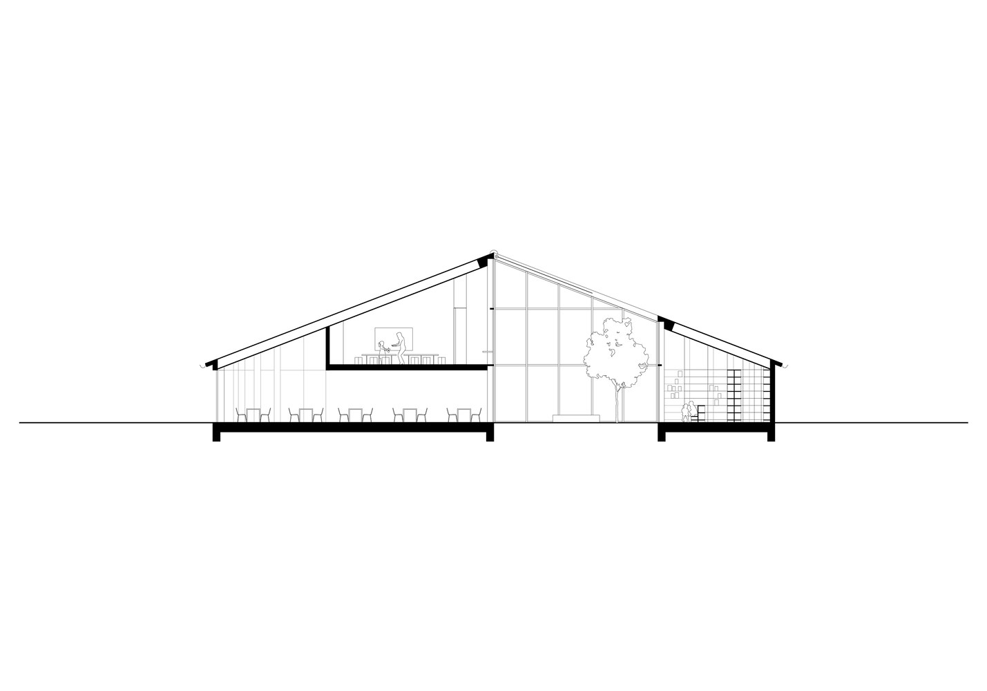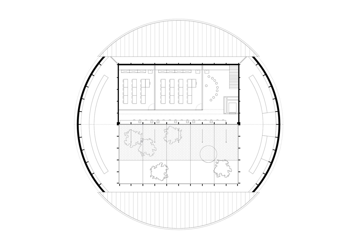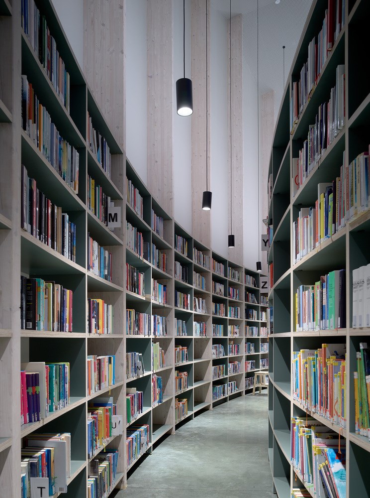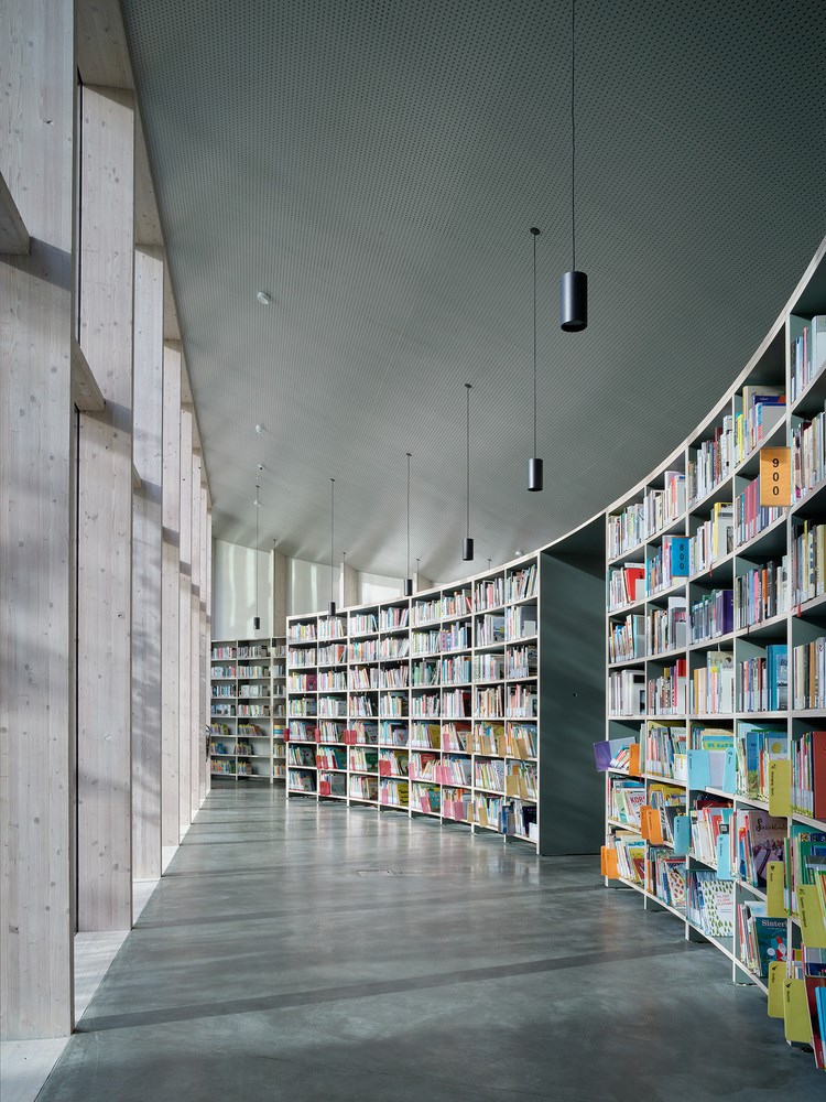 Binnen de cirkelvormige omtrek definieert een strakke houten kastenwand de ruimte. Deze structuur dient niet alleen als opslag, maar ondersteunt ook het dak en draagt bij aan de visuele eenheid van het interieur. Het gebruik van natuurlijke materialen en duurzame technieken, zoals een volledig geïsoleerd zadeldak en een slimme lichtinval, maakt de bibliotheek niet alleen esthetisch aantrekkelijk, maar ook energie-efficiënt.