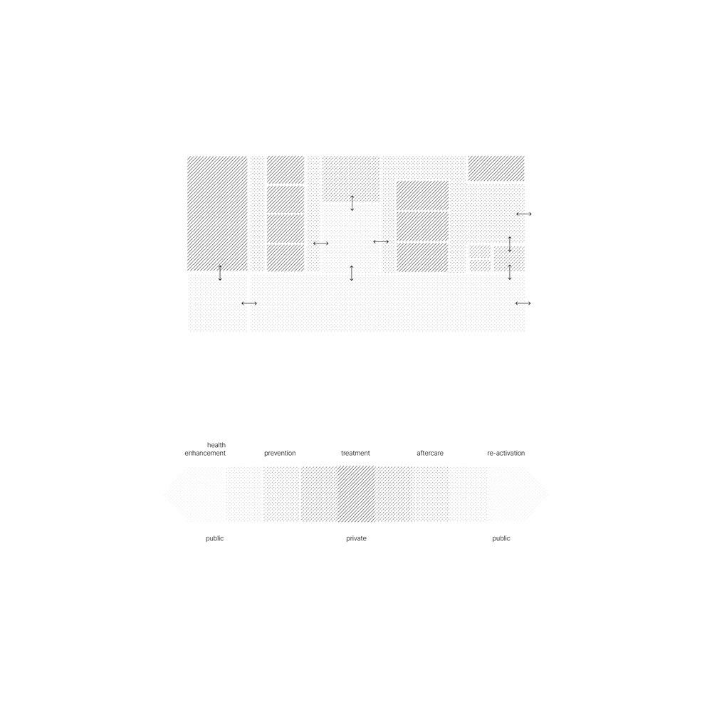 Elk van de ruimtes, van de zeer besloten dokterspraktijk tot de semipublieke binnenstraat, creëert een beschermende omgeving die mensen op verschillende momenten in hun gezondheidsspectrum ondersteunt. Er wordt veel aandacht besteed aan het juiste evenwicht tussen voldoende privacy en menselijke interactie. Bufferzones zorgen voor een geleidelijke overgang tussen openbare en privéruimten, en gefilterde uitzichten en fysieke verbindingen maken contact op elk moment mogelijk.
