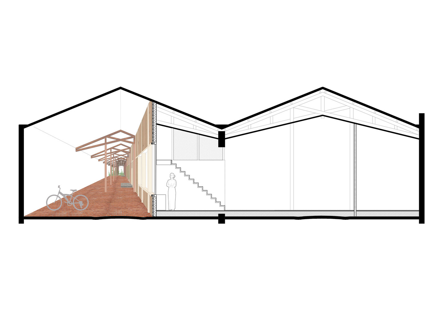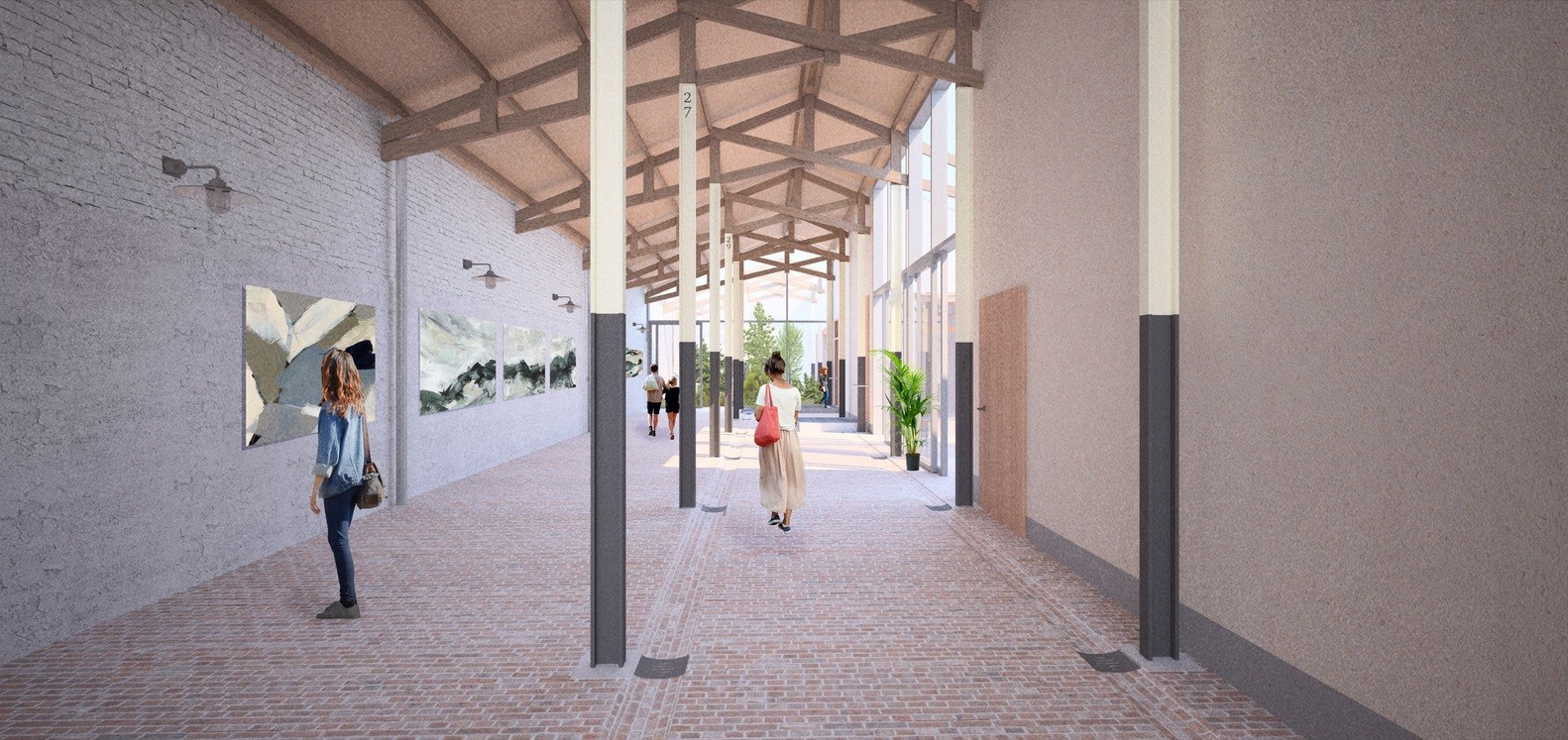 De functionele 'pockets' hebben elk hun eigen toegang(en) via de binnenstraat, die zich over de hele lengte van de ruimte uitstrekt en waar de majestueuze dakstructuur en volumetrie van de oude paardenstallen volledig tot uiting blijven komen. De clusters zijn onderling verbonden, zodat het project als één geheel functioneert en flexibel gebruik mogelijk maakt.