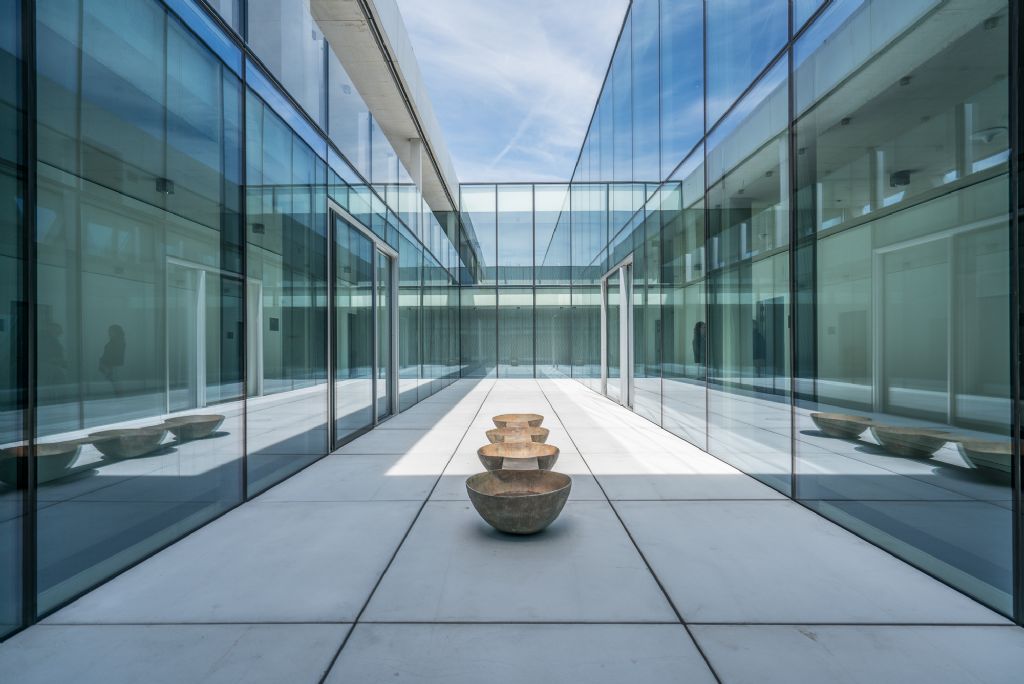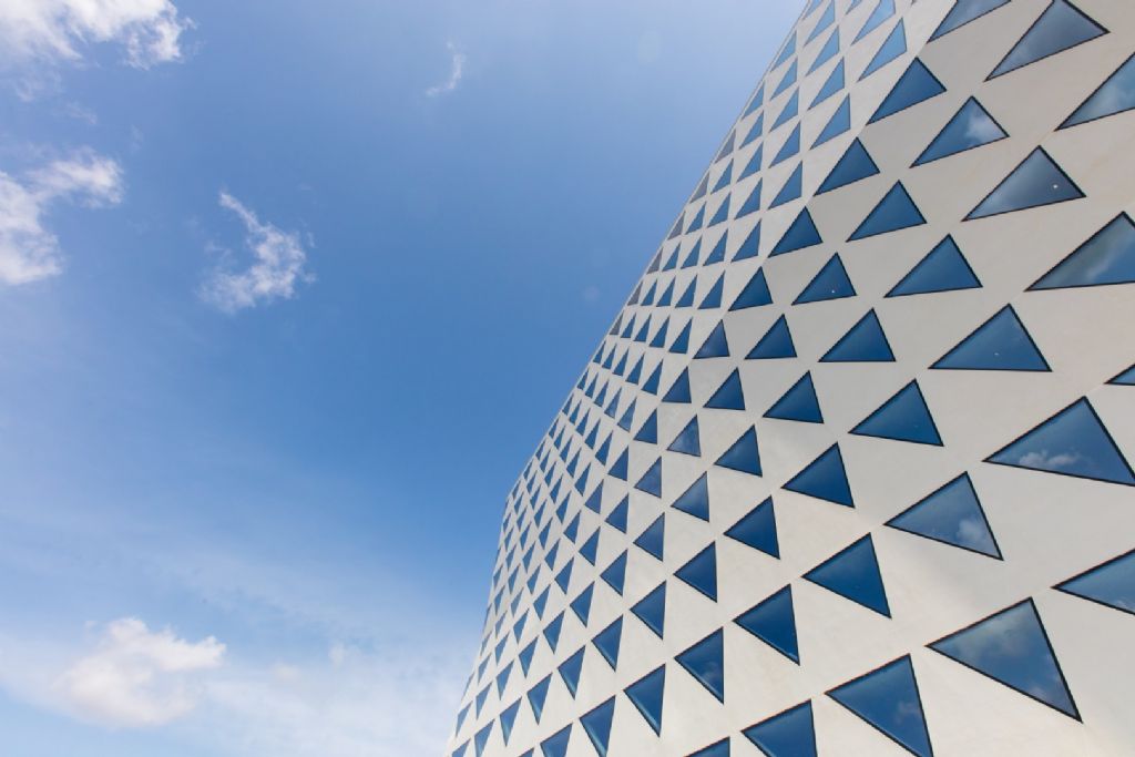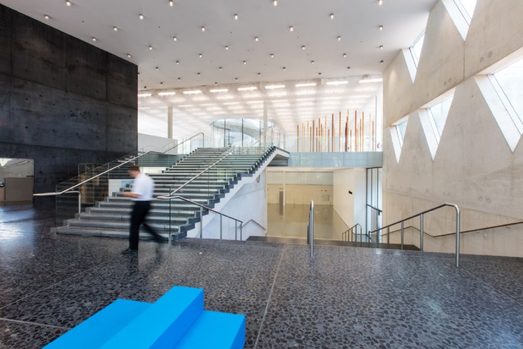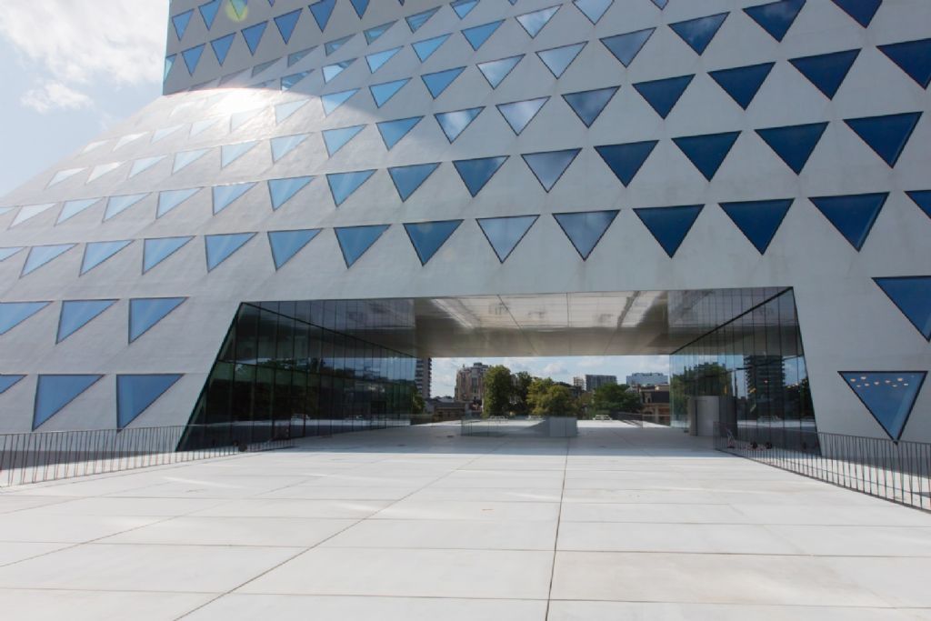 Een volledig transparante architectuur symboliseert het openbare karakter van exporuimten en auditorium en het democratische karakter van het congres in het onderste volume. Het hoofdgebouw dat schrijlings van de voorbouw contact maakt met het maaiveld, is volledig bedekt in glazen mozaïektegeltjes. Deze worden onderbroken door driehoekige ramen die een maximale daglichtinval verenigen met een minimale gevelperforatie.