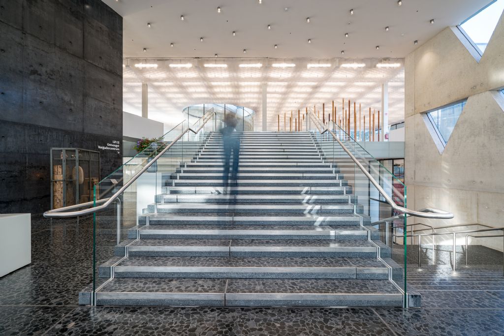 Het kantoorgedeelte biedt plaats aan ongeveer 660 kantoorwerkers. Zij delen verschillende types werkplekken. Op die manier wordt de ruimte efficiënt benut. De totale vloeroppervlakte kromp van 54.000 m² naar 22.000 m². De grootste uitdagingen in het project kwamen direct voort uit het architectonisch concept. Een rondom doorlopend bandraam zonder verticale profielen op het maaiveld verbindt de halfverzonken raadzaal en auditorium zo veel mogelijk met het park. Alle doorbuiging diende in de twee bovenliggende vloerplaten te worden opgevangen. Dit is gedaan door toevoeging van Stalen liggers op het bovenste niveau, horizontale kozijnprofielen die de beweging opvangen op het onderste niveau en verticale flexibele voegen tussen de glasbladen van het bandraam.