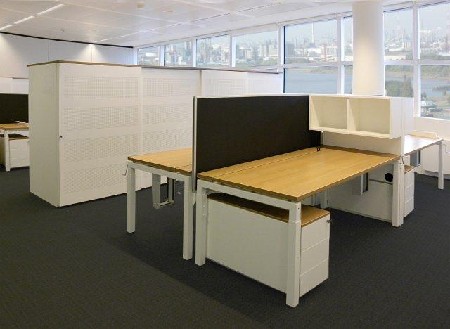 De archiveringskasten delen de ruimte in en bevorderen tegelijk de akoestiek dankzij hun geluiddempende materialen. Dankzij de lichte kleuren en geringe hoogte van de kasten blijft het gevoel van ruimte in de landschapskantoren aanwezig.