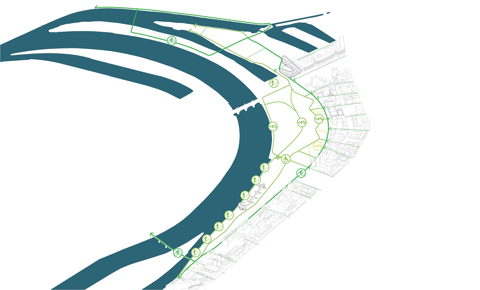 Het toekomstig park zet in op rivierherstel en krijgt het een overstromingsbestendige invulling. Het zorgt ook voor het landschappelijk herstel van de laaggelegen vergezichten die typerend zijn voor de Vltava rivier. Het terrasvormig opgebouwd parkontwerp faciliteert een geleidelijke overgang tussen natte zones langs de lagergelegen rivieroevers tot droge zones aan de hoger gelegen stedelijke rand van het park. Hierdoor ontstaan kansen voor een verhoogde biodiversiteit met een gradiëntrijke ontwikkeling van diverse vegetatietypes. De gevarieerde vegetatieopbouw zorgt niet alleen voor een verbeterde natuurlijke waterberging maar ook voor de nodige verkoeling tijdens warme zomerdagen.