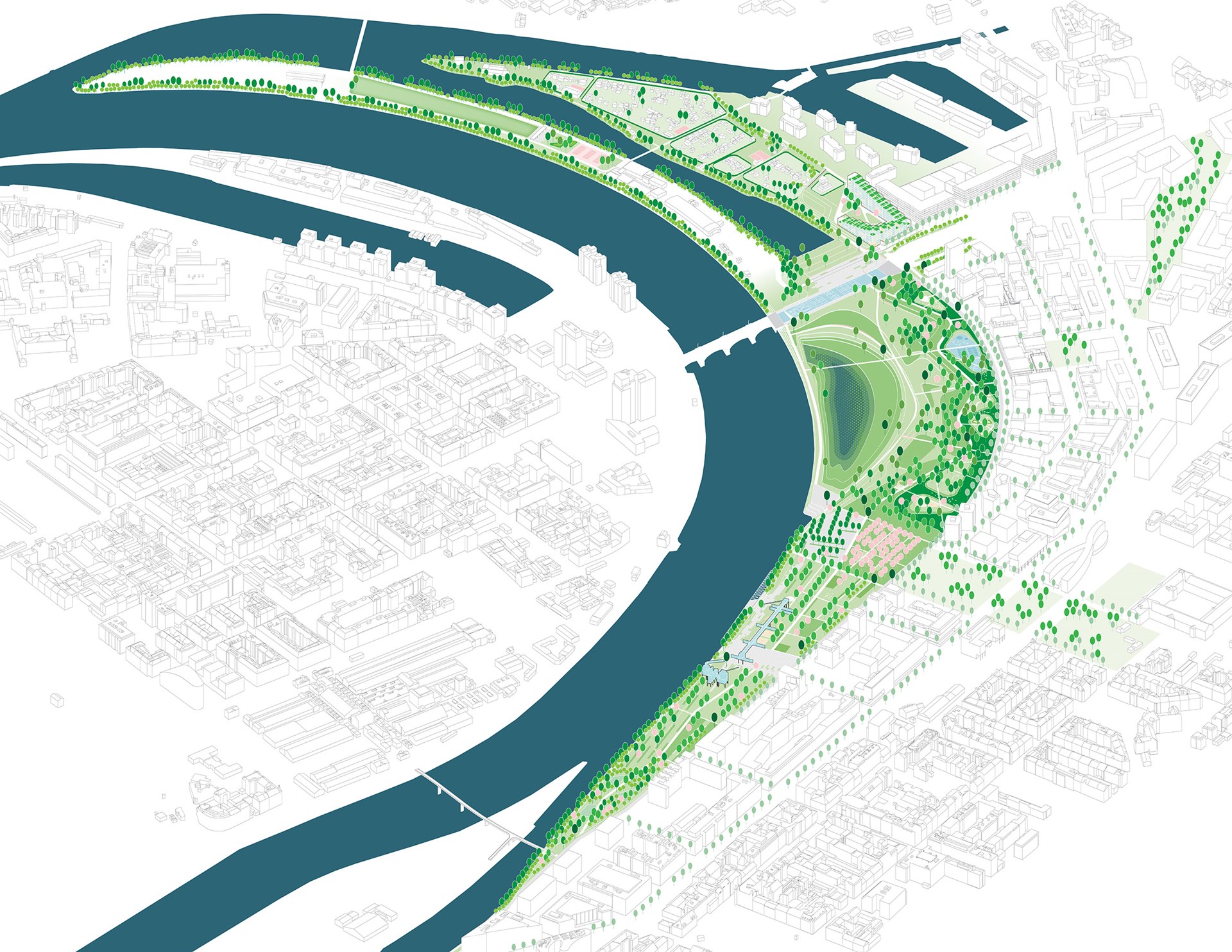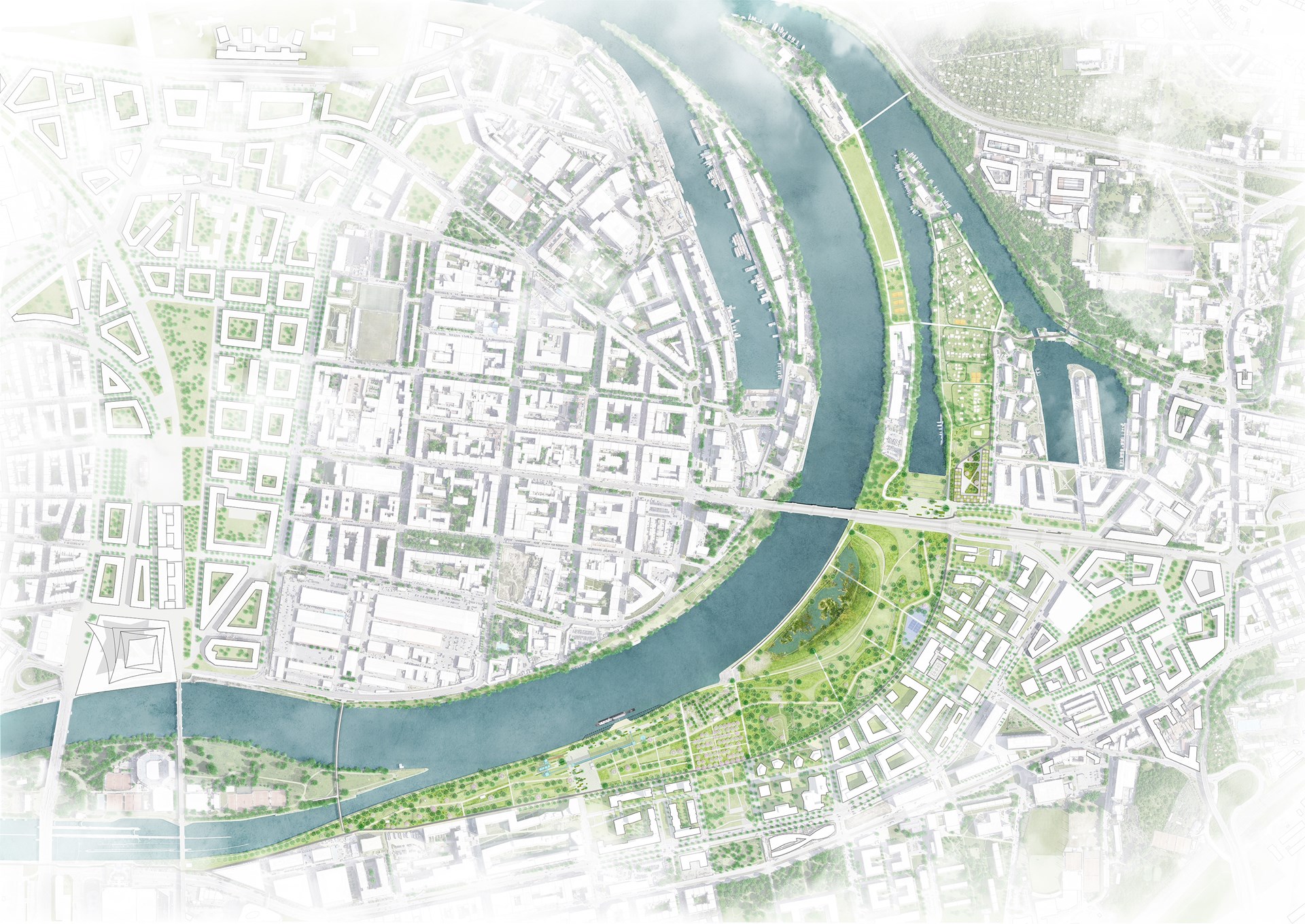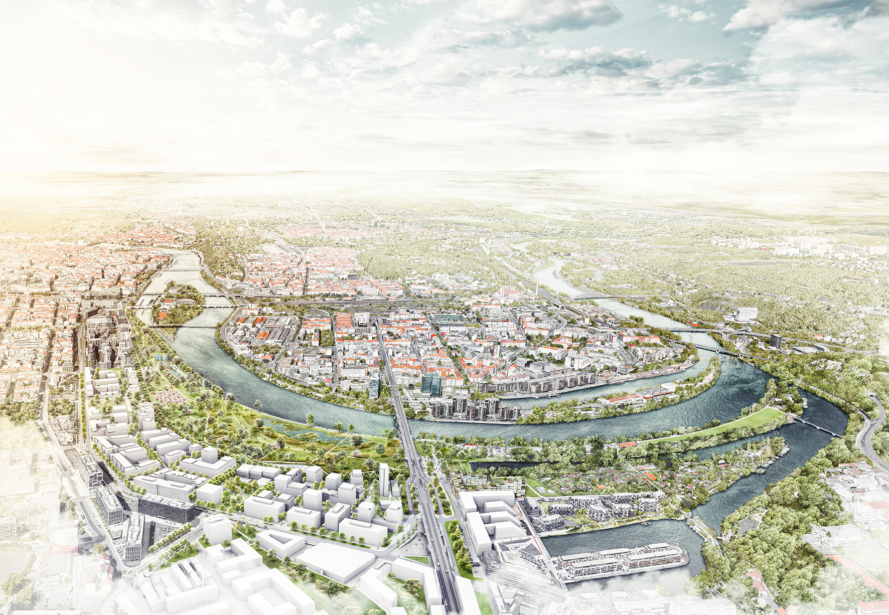 Het nieuw stedelijk park bevindt zich op een strategische locatie in de stad. De projectzone, die onder meer een voormalig rangeergebied omvat, ligt enerzijds op wandelafstand van zowel de dynamische nieuwe kern Karlin als de historische binnenstad van Praag. Het nieuwe park sluit tegelijk aan bij een bijzonder segment in het verloop van de Vltava rivier, een markante riviermeander. Vanuit deze unieke ligging zal het eiland Rohan, dat onderdeel is van de projectzone, transformeren van een opgehoogd voormalig rangeergebied tot een klimaatadaptief, hedendaags park. Door in te grijpen op de bestaande topografie ontstaat een markante, nieuwe riviermeander die periodiek overstroombaar is.