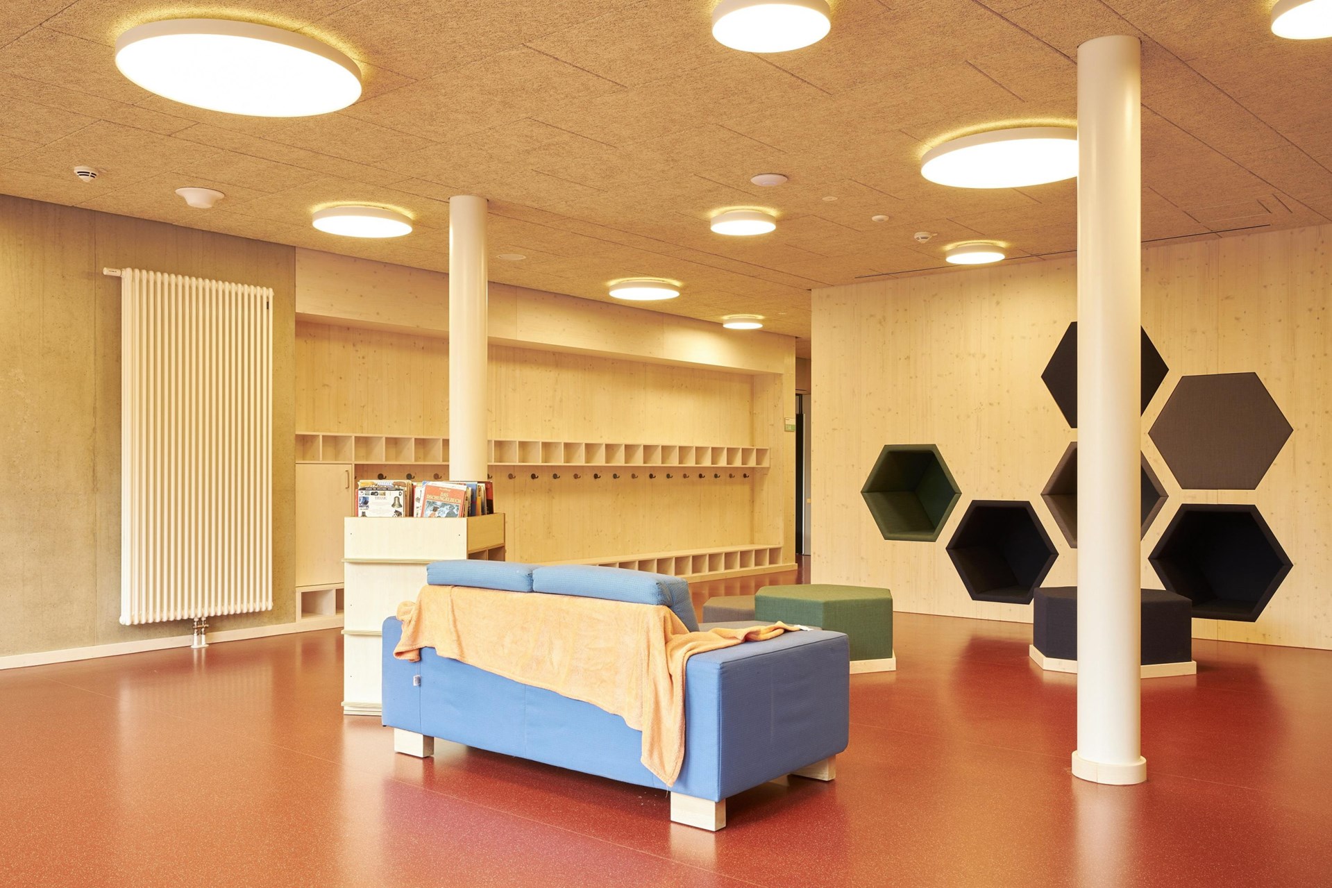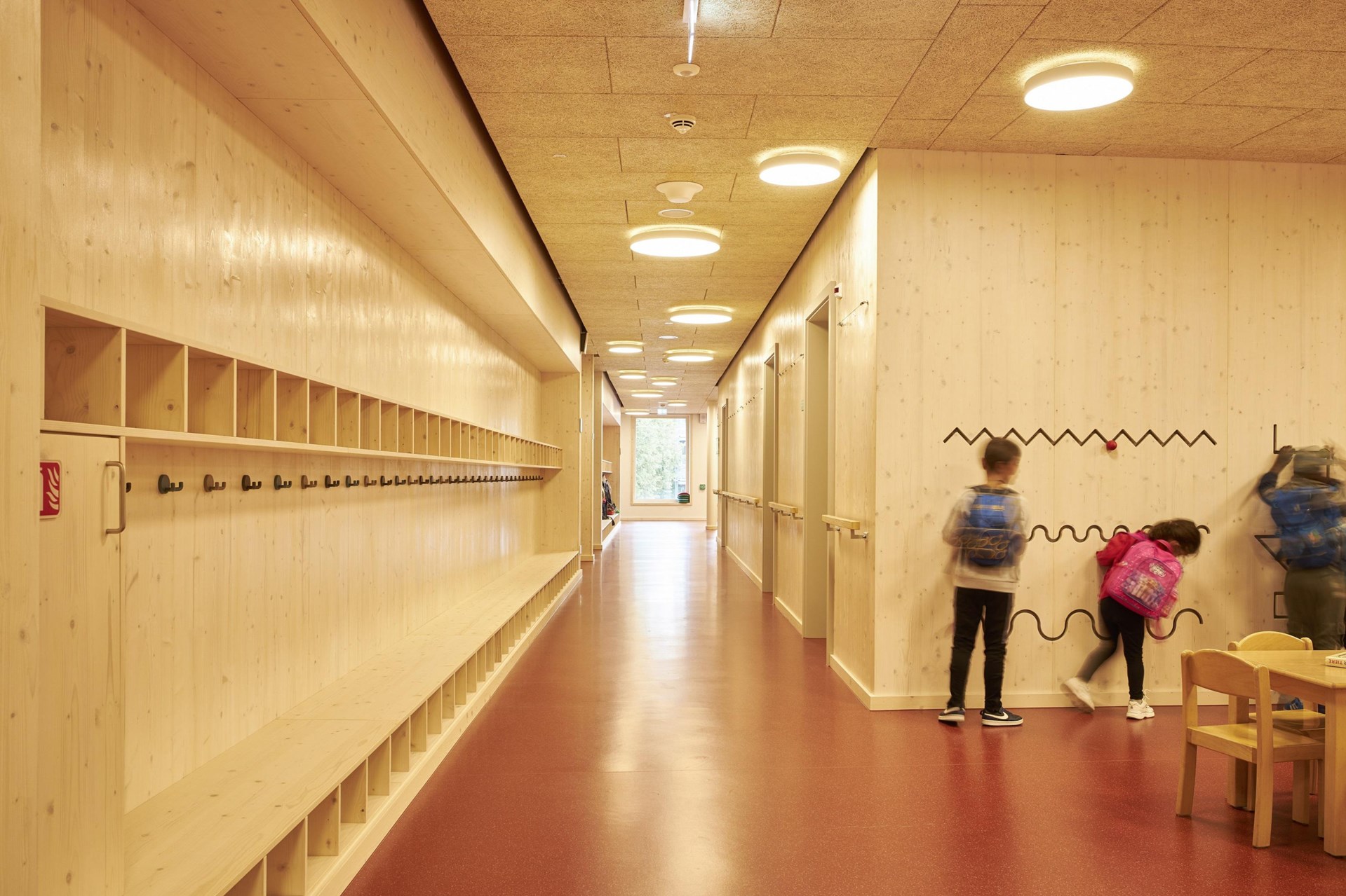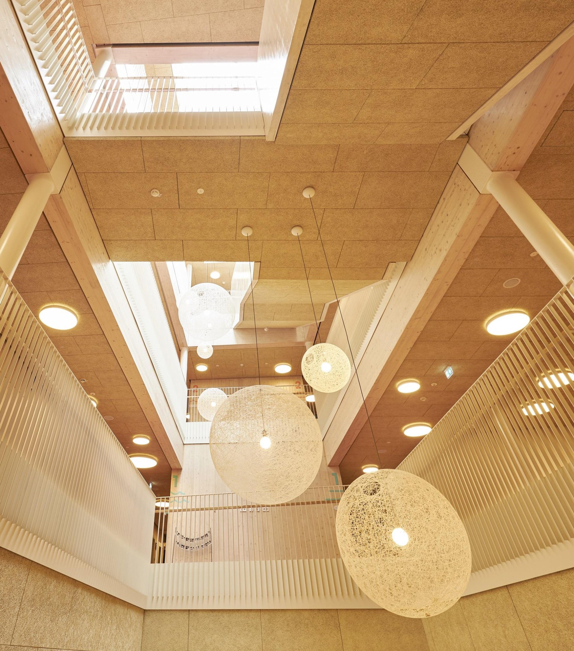 Zo dragen ook de Cradle 2 Cradle Gold Troldtekt Baffles en Troldtekt A2 panelen in crème tint, veelal verborgen bevestigd (K5N en K5FN), bij aan de open sfeer en de ontspannen uitstraling van dit houtrijke project.