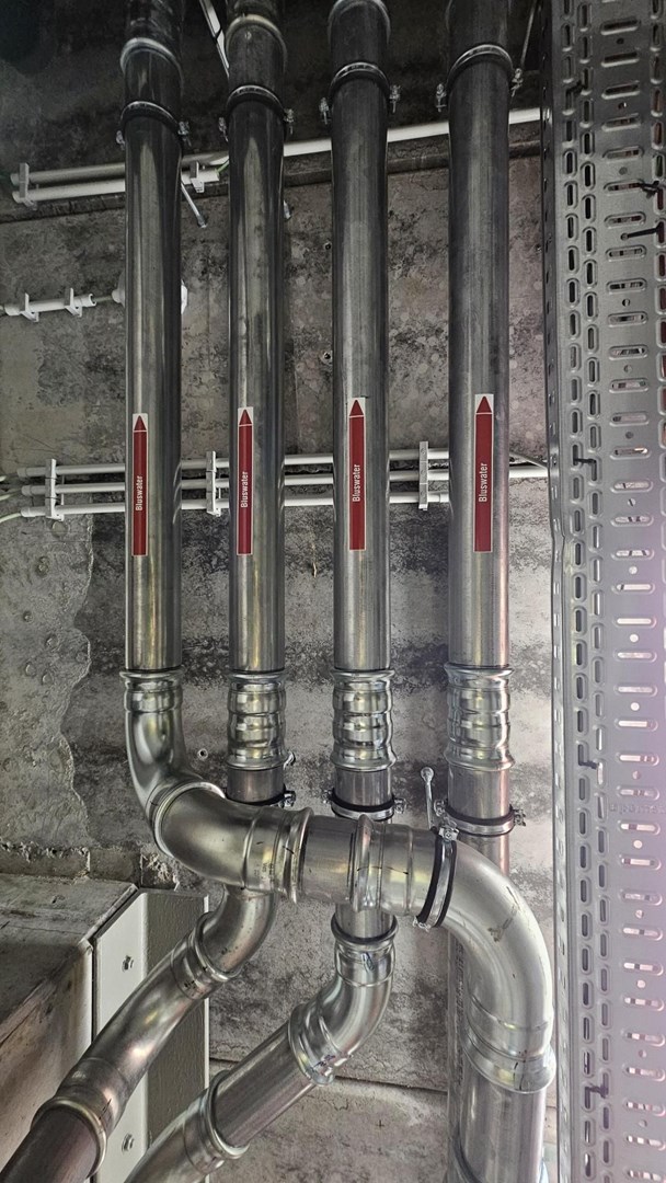 - Bluswatertoevoer: Het Geberit Mapress toevoersysteem in dubbelzijdig verzinkt C-staal garandeert een veilige en betrouwbare waterstroom.