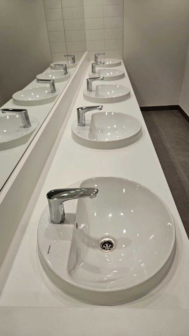 - Sanitair: Het gebouw is uitgerust met Geberit Systemfix installatie-elementen, Geberit hang-wc’s, Selnova urinoirs met verborgen spoeltechniek en VariForm wastafels.
