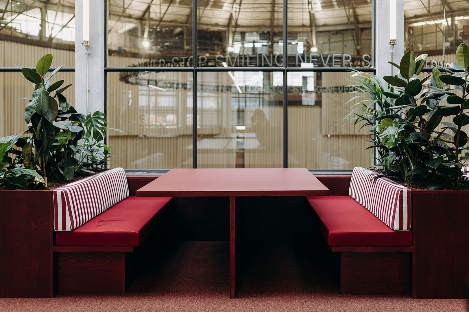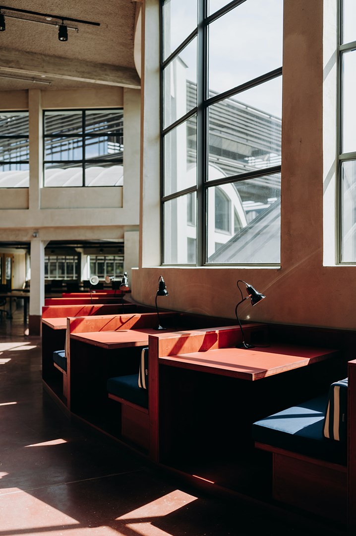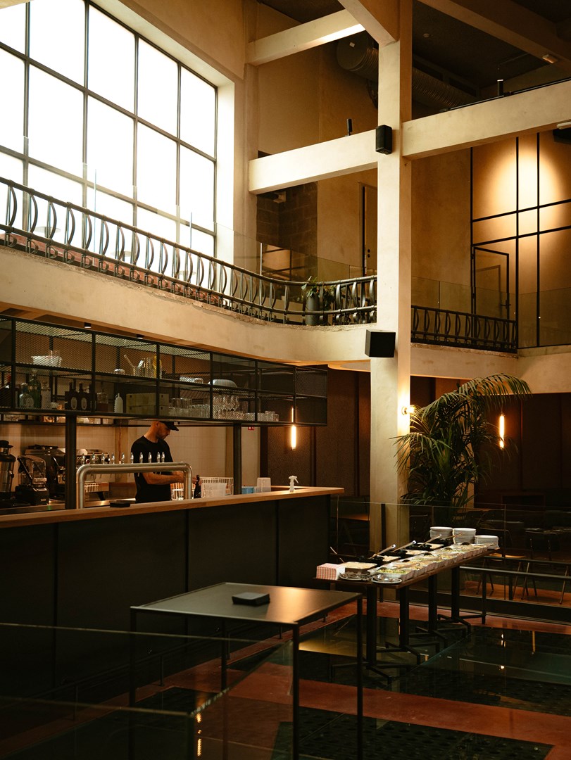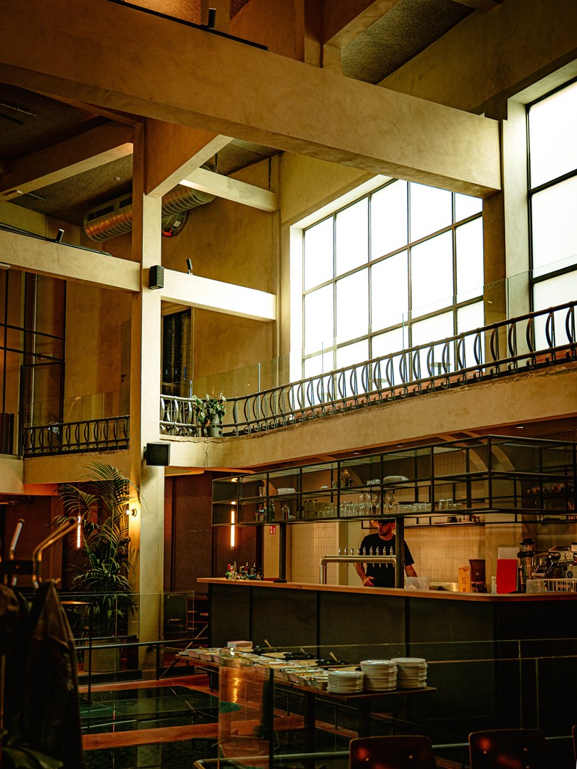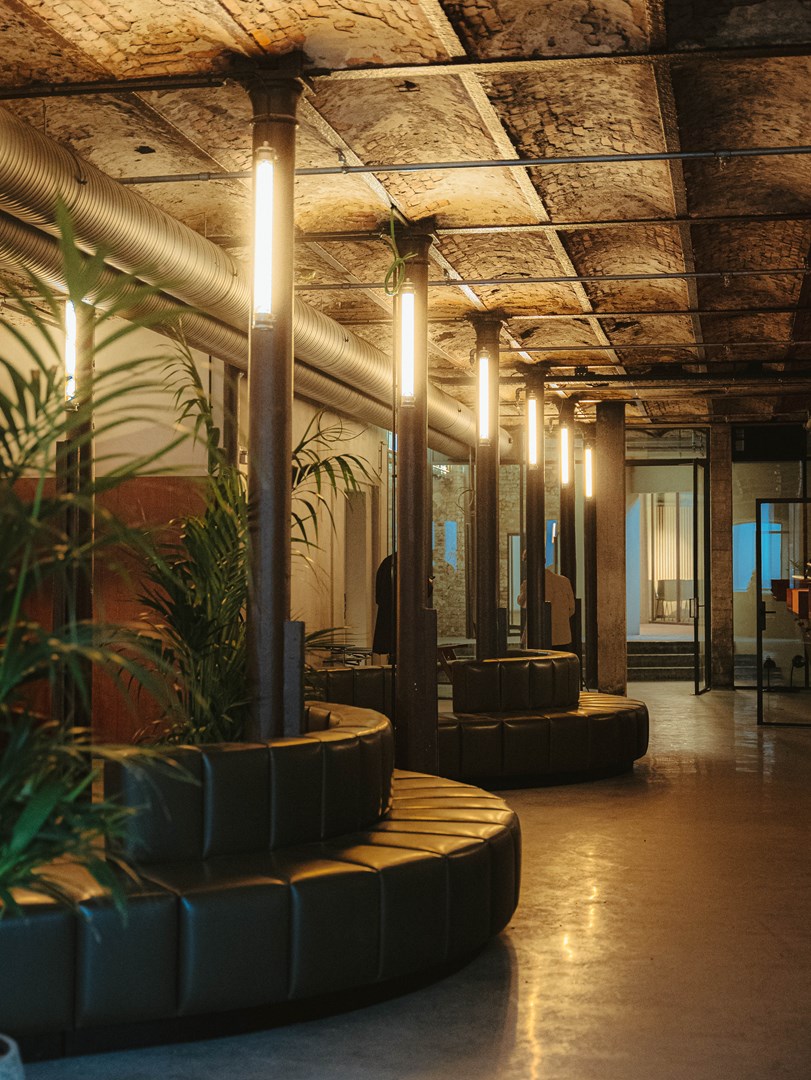 Daarnaast ontwierp het team twee horecagelegenheden: een sushirestaurant op de eerste verdieping en het centrale café, Bar Bougie, met zicht op de Arena. Bar Bougie is gevestigd in de voormalige smeerput van de garage en combineert hout en warme verlichting met de originele groene staalstructuur en betonnen elementen. Dit zorgt voor een balans tussen moderniteit en authenticiteit.