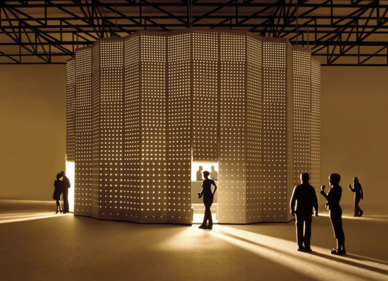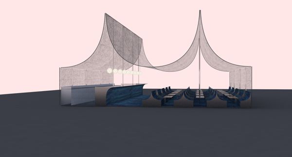 In Behind the Curtain kunnen bezoekers via golvende gordijnen ontsnappen naar intieme ruimtes met luxueuze marmeren tafels. "Net zoals in het centrum van eender welke grote stad is ruimte op beurzen een schaars goed," schrijven de ontwerpers. "Een bezoek aan een beurs kan een vermoeiende ervaring zijn." In deze context zochten de Belgische ontwerpers naar een oplossing. Die vonden ze in een barontwerp dat met gordijnen ongewenst geluid en visuele prikkels blokkeert.