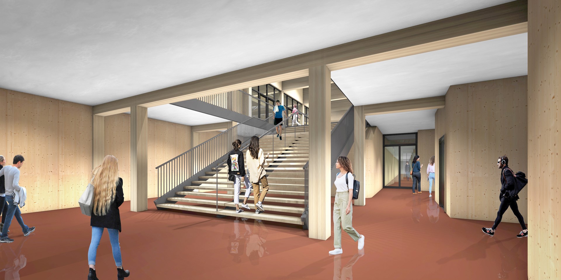 In de sportzalen zijn houten vakwerkspanten toegepast, die dankzij mechanische verbindingen ook volledig demontabel en herbruikbaar zijn. Het thermisch gemodificeerd hout aan de gevel is door te zijn gestoomd in een zuurstofloze omgeving zeer weerbestendig geworden, zonder de toepassing van giftige chemicaliën.