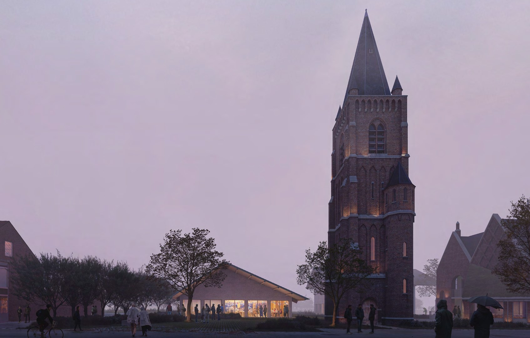 De nieuwe zaal is gepositioneerd om optimaal uitzicht te bieden op het omringende landschap, waarbij de kerk en klokkentoren extra geaccentueerd worden. De architectuur sluit subtiel aan bij de daken van de kerk en omliggende gebouwen, waardoor de zaal verweven wordt met de geschiedenis en omgeving van Ettelgem. Het interieur biedt een lichte, aangename ruimte met uitzicht op het landschap, terwijl de keuze voor warme materialen een huiselijke sfeer creëert. Een mezzanine met extra ruimtes zorgt voor een intieme hoek die in verbinding staat met de zaal, en buiten zijn de overdekte speelruimtes direct verbonden met de draagstructuur van het gebouw.