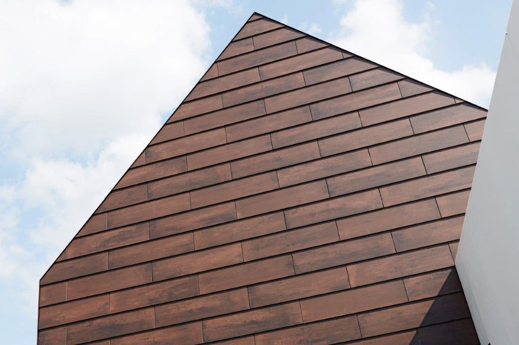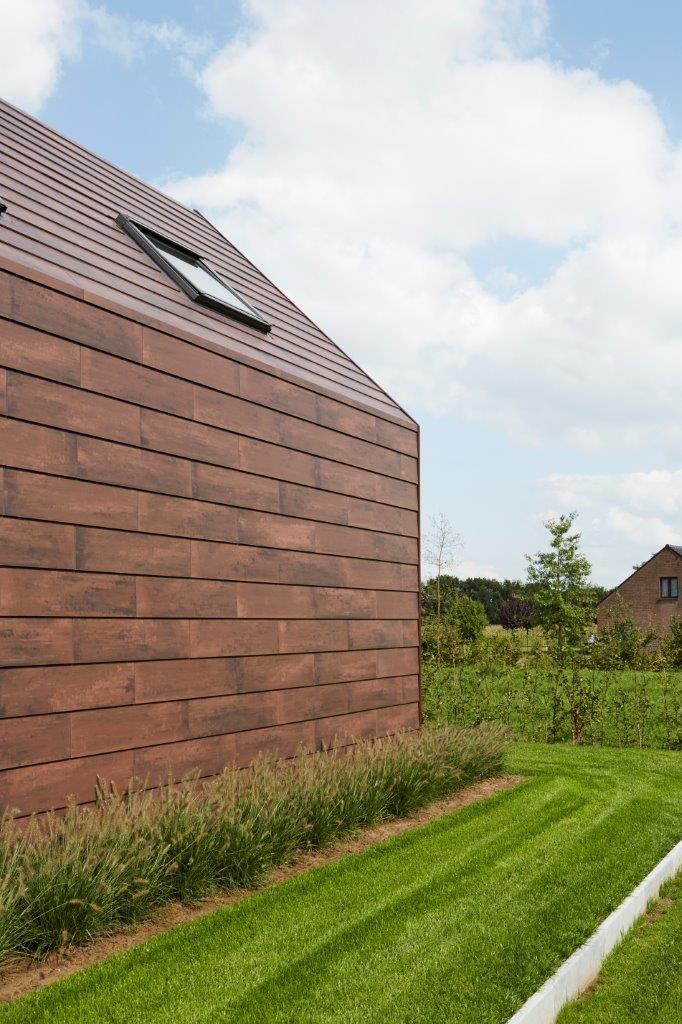 Om de oude dakpan zo goed mogelijk te benaderen, liet AIM de tegels verzagen tot 30x120 centimeter. Dit gebeurde door de aannemer zelf, aangezien hij tevens zaakvoerder van het bedrijf Drooghmans geveltechnieken is. “Samen met de aannemer kozen we ervoor om de tegels in overlapping te plaatsen, zoals gebruikelijk is bij dakpannen”, vertelt Wattecamps. “De tegels zijn aan de achterzijden ingeboord om aluminium clips te kunnen installeren. Met die clips werden ze vervolgens op een aluminium regelwerk vastgehaakt.”