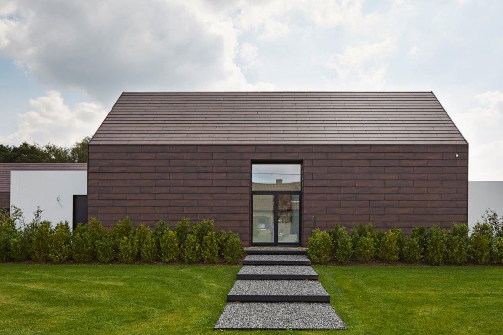 De gekozen materialen passen perfect binnen het historisch kader waarop het ontwerp van AIM zinspeelt. “We wilden het gevoel van het archetypische hellende dak oproepen, waardoor de keuze al snel viel op de Terra Maestricht 208 V 60x120 centimeter van Mosa”, verklaart Wattecamps. “Met deze bruinrode tegel met hier en daar een zwarte vlam, kwamen we het dichtst in de buurt van de keramiekkleur die we voor ogen hadden. Het mooie contrast met de witte volumes bleek een surplus.”