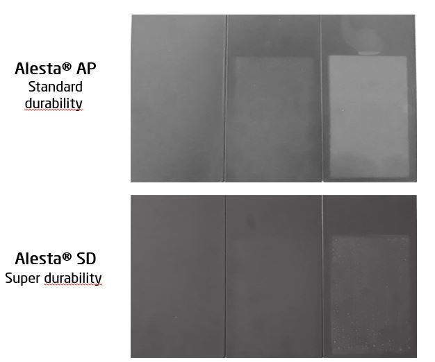 Hetzelfde gaat op voor de poederlak zelf. Christiaen Callens: “Wat wordt er precies verwacht van de poederlak? Hoe lang moet die meegaan? Daar onderscheiden we twee kwaliteiten die bepaald zijn door Qualicoat, een Europese organisatie die kwaliteitseisen oplegt voor lakwerk op aluminium: AE of architecturale polyester en SD of super durable. AE is de standaardklasse die in Europa op 95 % van de projecten wordt toegepast. De laatste twee jaar zien we een stijgende tendens in het voordeel van het meer UV-bestendige SD. Voor grote projecten zoals bijvoorbeeld ziekenhuizen wordt deze kwaliteit vandaag meer gebruikt.”
