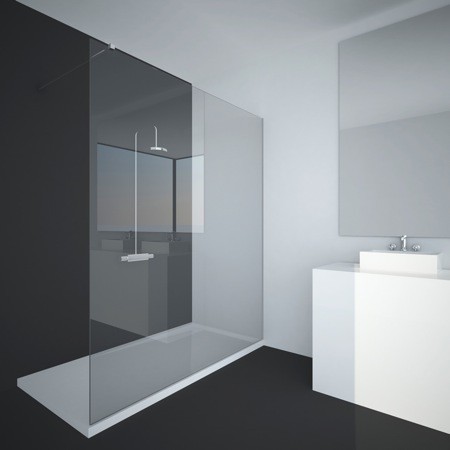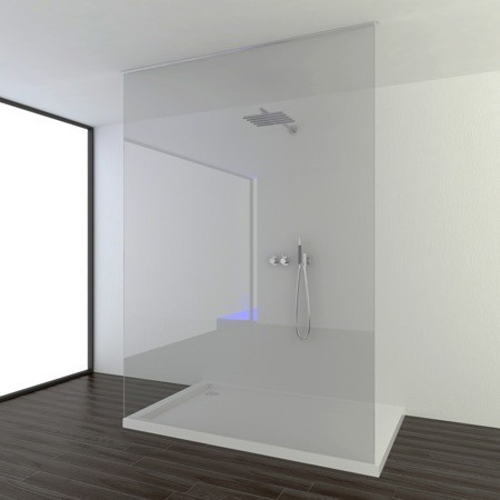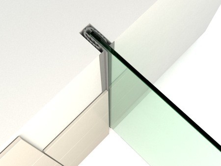 De eindgebruiker krijgt immers een volle glaspartij die mooi overvloeit in zijn betegelde muur, of dit nu een rechte dan wel schuin aflopende muur is, en hij hoeft ook geen zichtbaar profiel te onderhouden. Voor de eigenlijke betegeling slijpt de installateur een groef in de muur van boven naar beneden, met een speling van 15 mm diep en 12 mm breed. Het aluminium profiel wordt in de groef gebracht. Na betegeling van de muur kan de installateur het 8 mm glaspaneel in het profiel schuiven. Het glaspaneel wordt ingeklemd met een waterdichte kunststofdichting. Dus geen gebruik van siliconen op de muur die na verloop van tijd toch maar zouden losweken... Met diezelfde kunststofdichting wordt het glaspaneel vervolgens netjes waterdicht gemaakt tegen de muur.