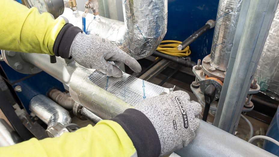 “De lamellendekens en pijpschalen van rotswol met een aluminiumfolie toplaag kunnen op maat worden gesneden en vastgezet met de TECLIT Alutape. Naden en verbindingen die in het isolatiewerk met TECLIT ontstaan worden ook met die Alutape afgeplakt. Daarmee wordt het werk visueel één geheel met een mooi, strak en naadloos resultaat tot gevolg”, zegt Jerry van der Meij tevreden.