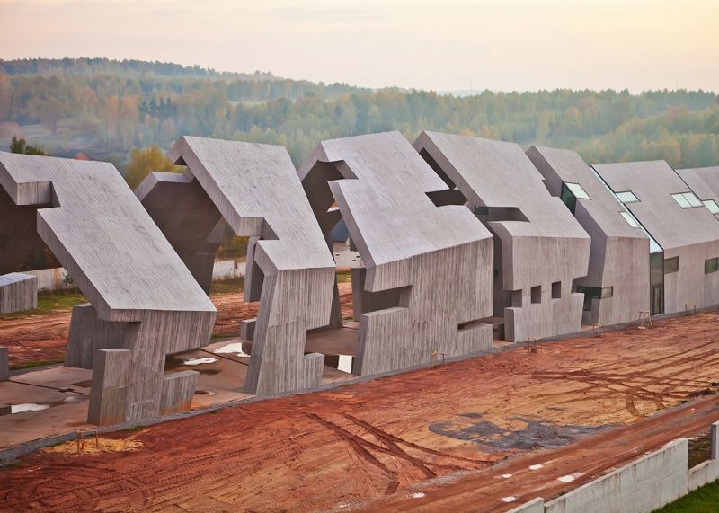 De foto's laten een rij huizen naast elkaar zien, met openingen waar de ramen komen. De oppervlakken zijn voorzien van een houtachtige korreltextuur die in het beton geprint is.