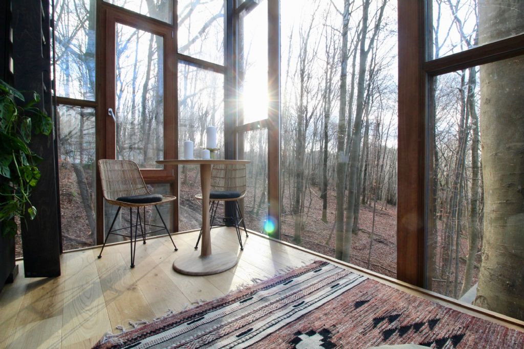 Deze boomhut is een glazen kubus van 4.5 x 4.5 m met rondom rond glaspartijen die 360 graden uitzicht bieden op een hoogte van 4 m. De cube is één ruimte die voorzien is van één saniblok / centraal element waar alles is in ondergebracht is. De bedoeling was om een zo compact mogelijke vorm te ontwerpen die toch ruimtelijk aanvoelt. Daarbovenop is de cube ook voorzien van een dakterras middenin het bladerdek.