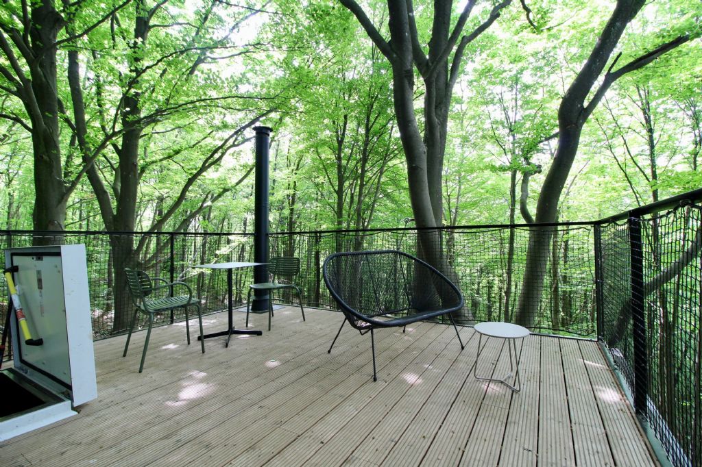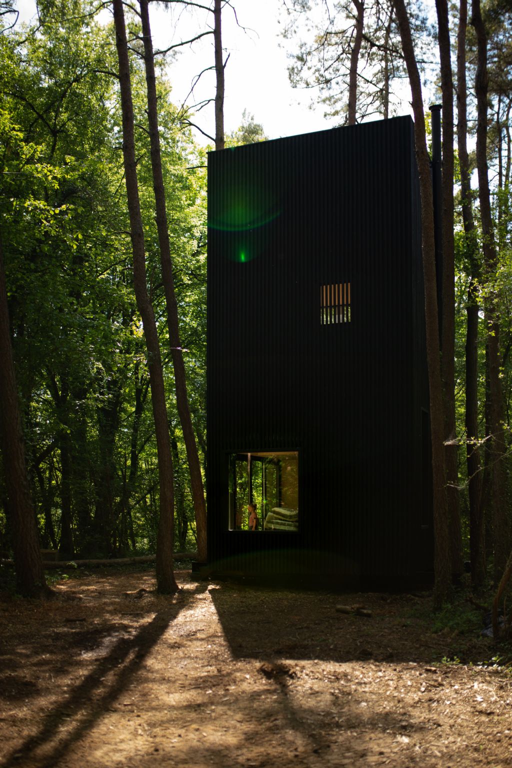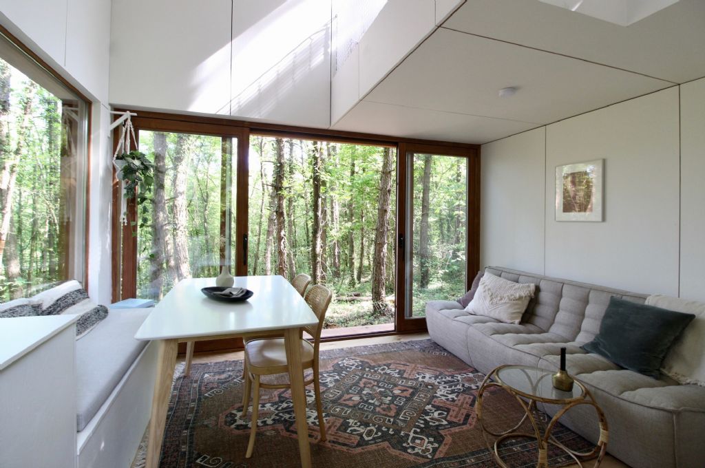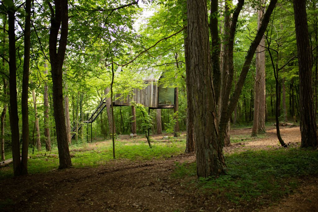 Deze boomhut is een uitgepuurde vorm van een fermette. De bedoeling was om twee zichtlijnen te creëren: één naar de omliggende omgeving en één naar het bos, dit door middel van twee grote raampartijen. Het sanitaire blok zit hier ook in het midden waarrond de rest van de ruimtes zijn ondergebracht. Het slaapgedeelte bevindt zich in een mezzanine, wat zorgt voor een knusse sfeer.
