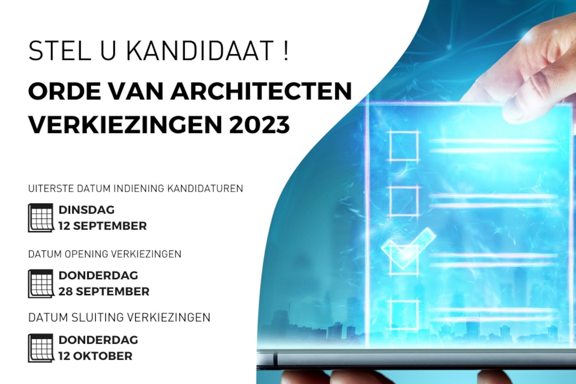 Geïnteresseerde architecten kunnen zich nog tot en met 12 september kandidaat stellen voor een mandaat bij de Orde van Architecten. Meer informatie over de verkiezingen kan worden teruggevonden op de website van de Vlaamse Raad van de Orde van Architecten: architect.be.