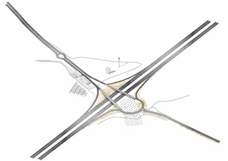 De verkeerswisselaar ontleent zijn vorm daarom aan een grondige lezing van de omringende landschappen. Infrastructuur, landschappelijke inpassing en architectuur vormen daarbij één onscheidbaar geheel. Ten noorden wordt het karakter van het gebouwde landschap versterkt, met zijn objecten zoals de watertoren, de gsm-mast en de carpool parking. Ten zuiden wordt het cultuurlandschap van Haspengouw doorgetrokken onder het complex tot aan de snelweg. De verkeerswisselaar zelf wordt overheen deze twee landschappen gespannen, in een omarmende beweging. Er ontstaat een helder schema waarbij landschap en infrastructuur elkaar versterken.