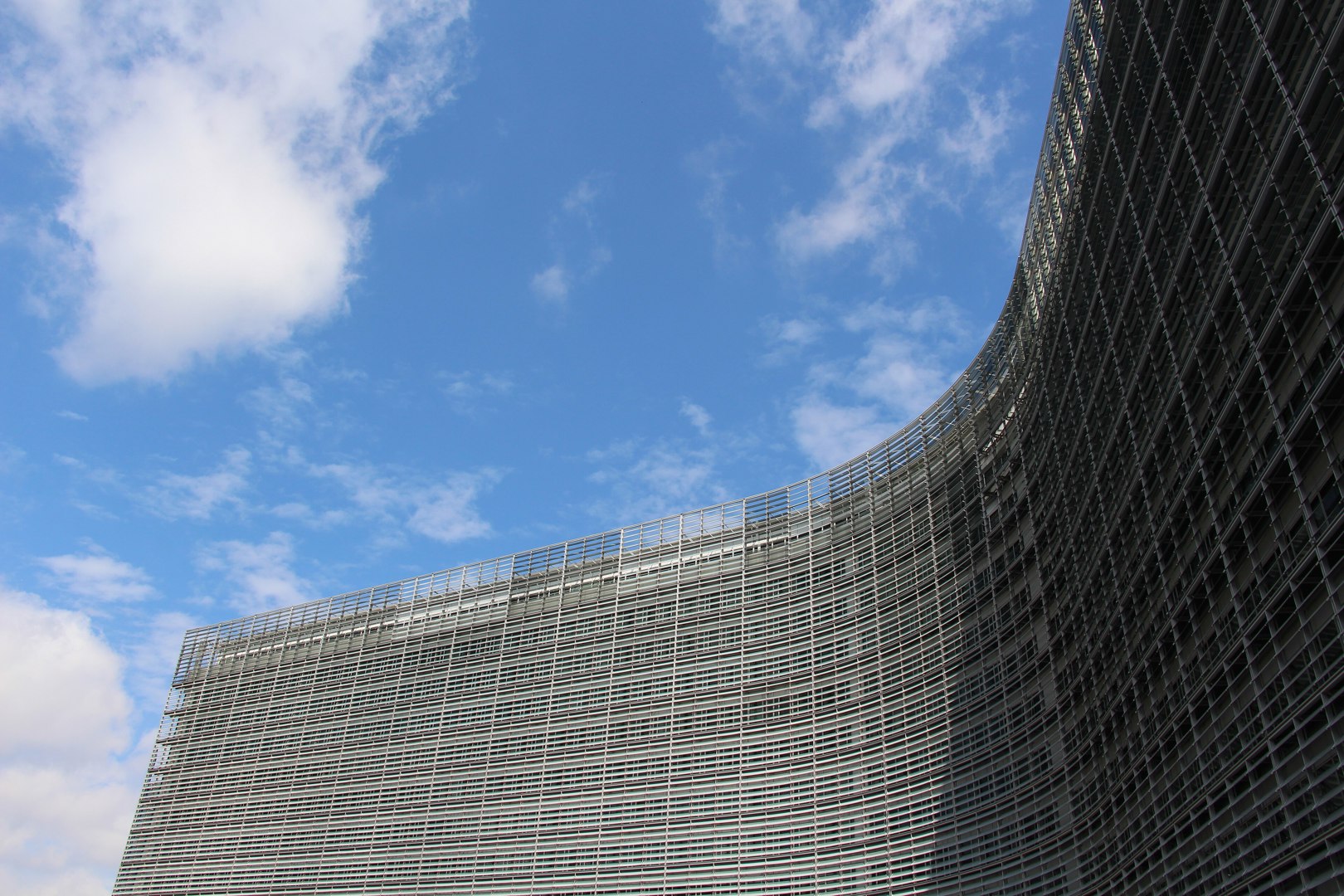 Het Berlaymontgebouw, het hoofdkwartier van de Europese Commissie en wellicht het machtigste gebouw van de Unie, rijst op als een gesloten metalen gordijn. Het kruisvormige grondplan is ontworpen voor interne efficiëntie, niet voor publieke leesbaarheid. De gevel, opgebouwd uit een dubbele huid van glas en lamellen, suggereert transparantie maar functioneert in de eerste plaats als een technisch systeem dat licht en warmte reguleert.