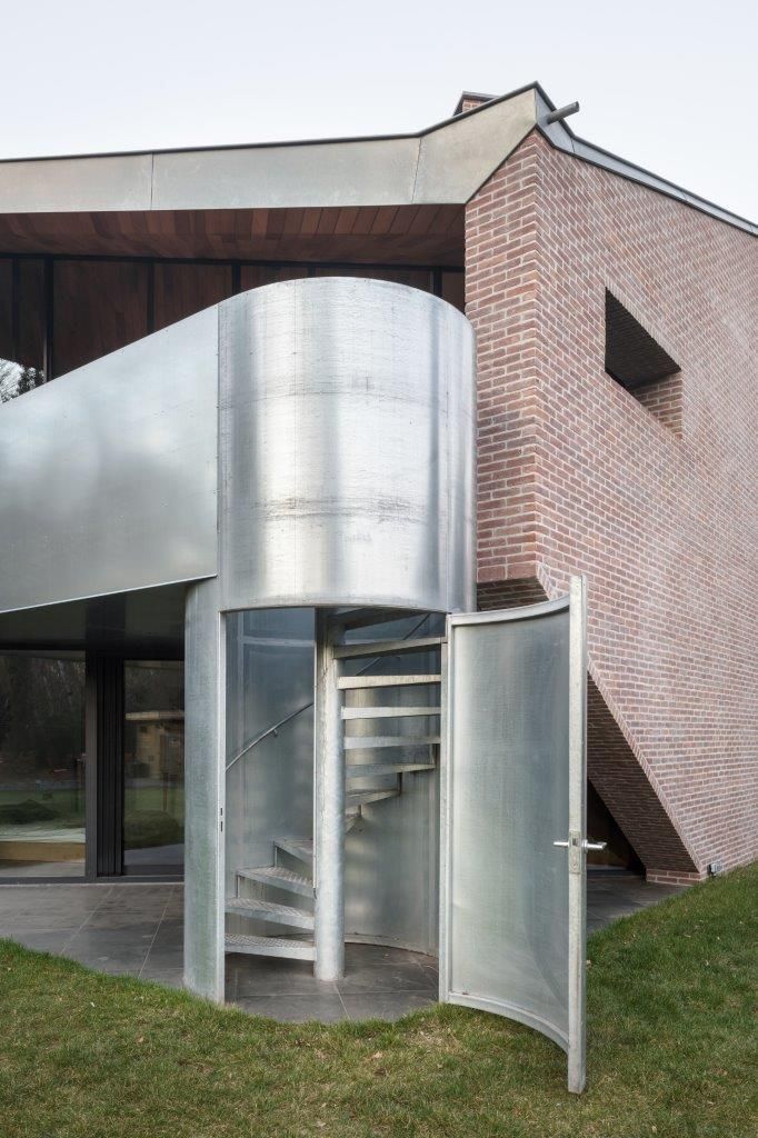 Vanuit de inkom leidt een spiltrap naar de leefruimte op de eerste verdieping. De achtergevel is volledig opengewerkt en geeft uit op een groot dakterras. Een andere spiltrap, in een stalen koker, verbindt het terras met de tuin.