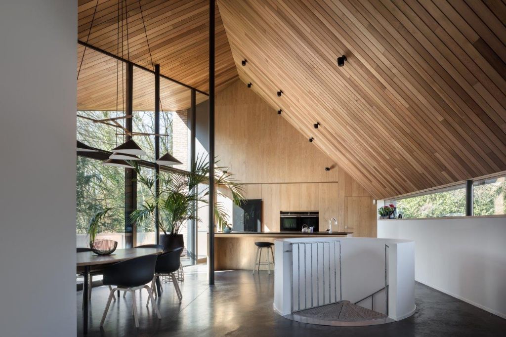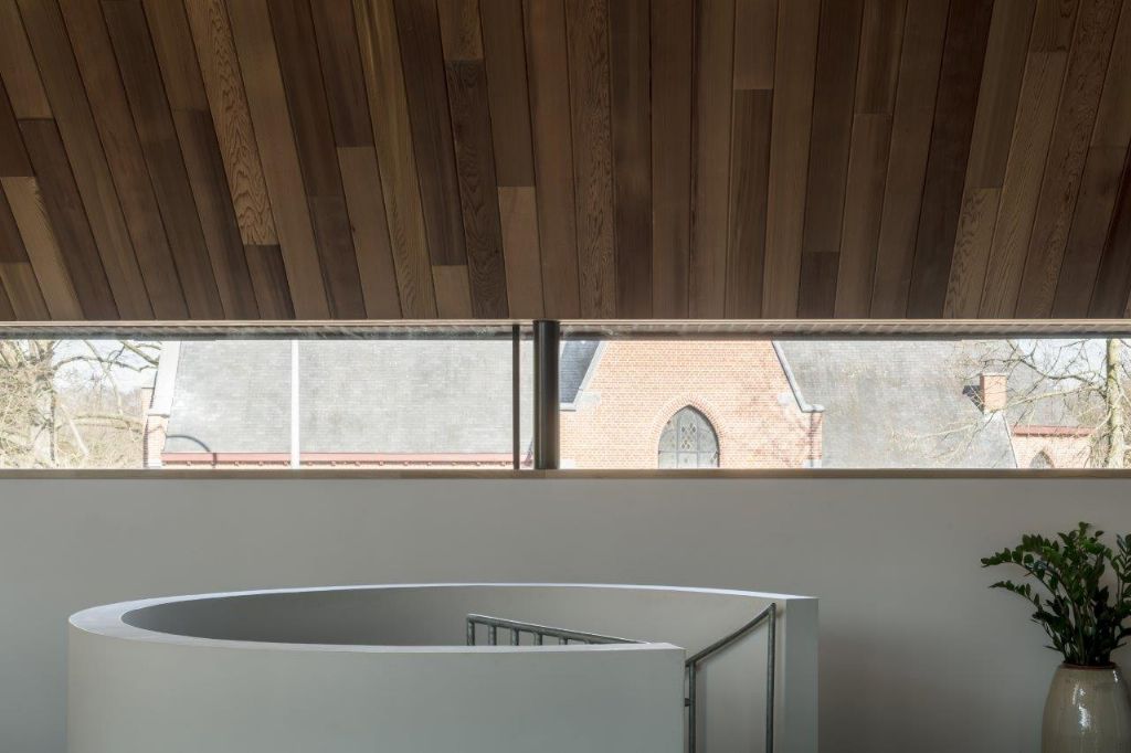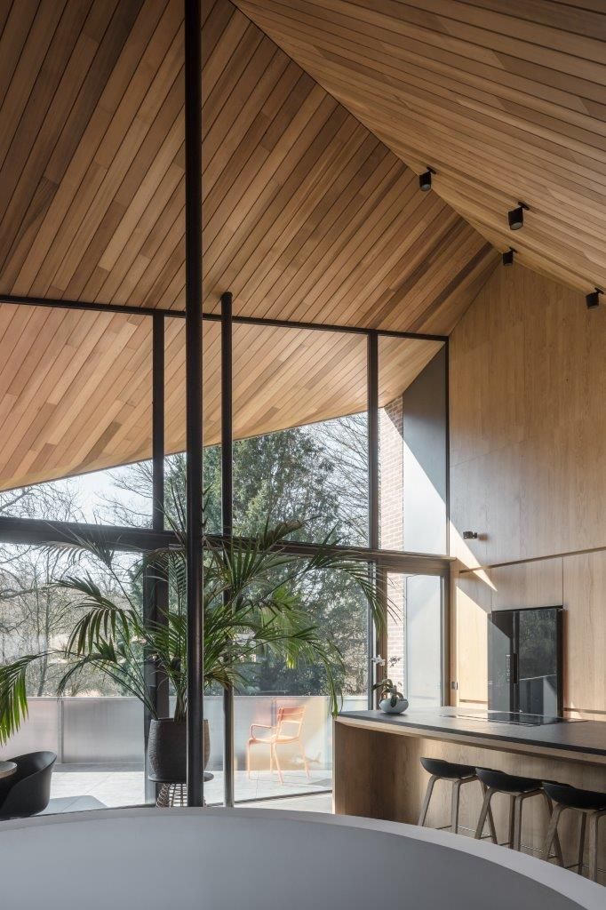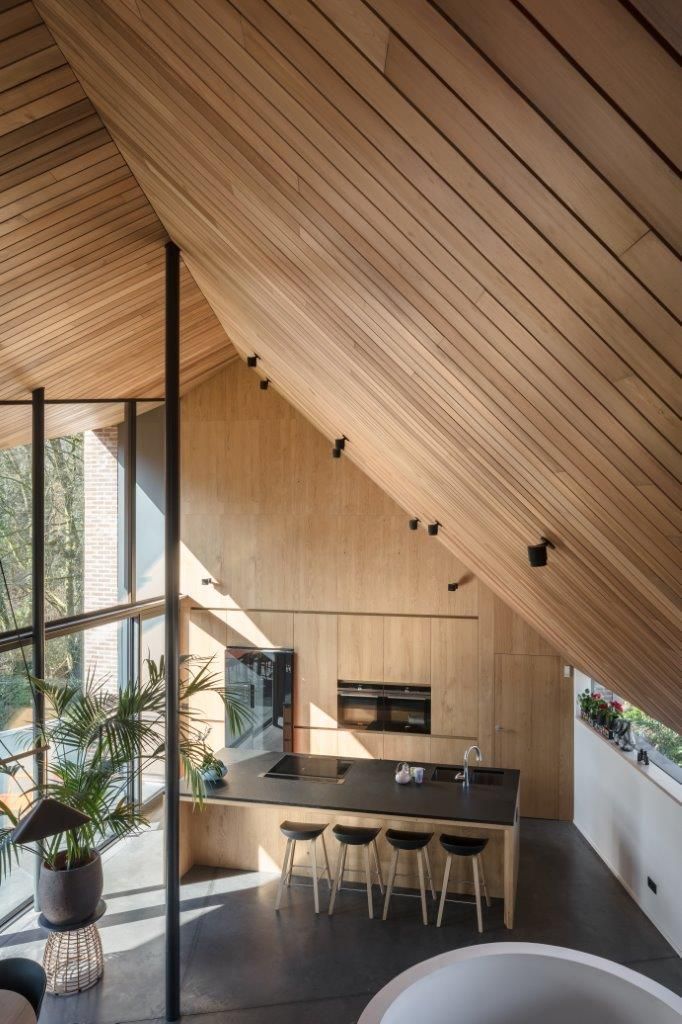 De indeling, met het slaapgedeelte op het gelijkvloers en de leefruimte op de verdieping, is atypisch maar heeft zeker voordelen. Zo blijven de slaapkamers koel en heeft iedereen van hieruit rechtstreeks toegang tot de tuin. Op de verdieping is er veel ruimte onder het hellende dak. In de nok wordt een mezzanine geplaatst met daaronder een intiemere zithoek. Het overdekte dakterras dat aansluit op de leefruimte biedt een wijds zicht op het achterliggende natuurgebied.