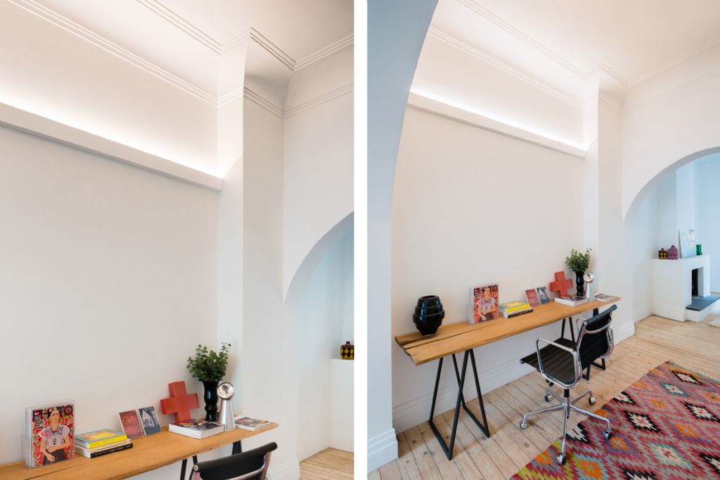 In het bureautje beneden, waar weinig daglicht binnenvalt, worden de hoogte van de ruimte en de lijsten extra in de verf gezet door een strak indirecte verlichtingsprofiel (L3). Die zachte verlichting zorgt bovendien voor een gezellige sfeer in de kamer De hoge, strakke High Line plinten van de Belgische designer Pierre Daems liggen dan weer in lijn met het modernistische karakter van de woning.