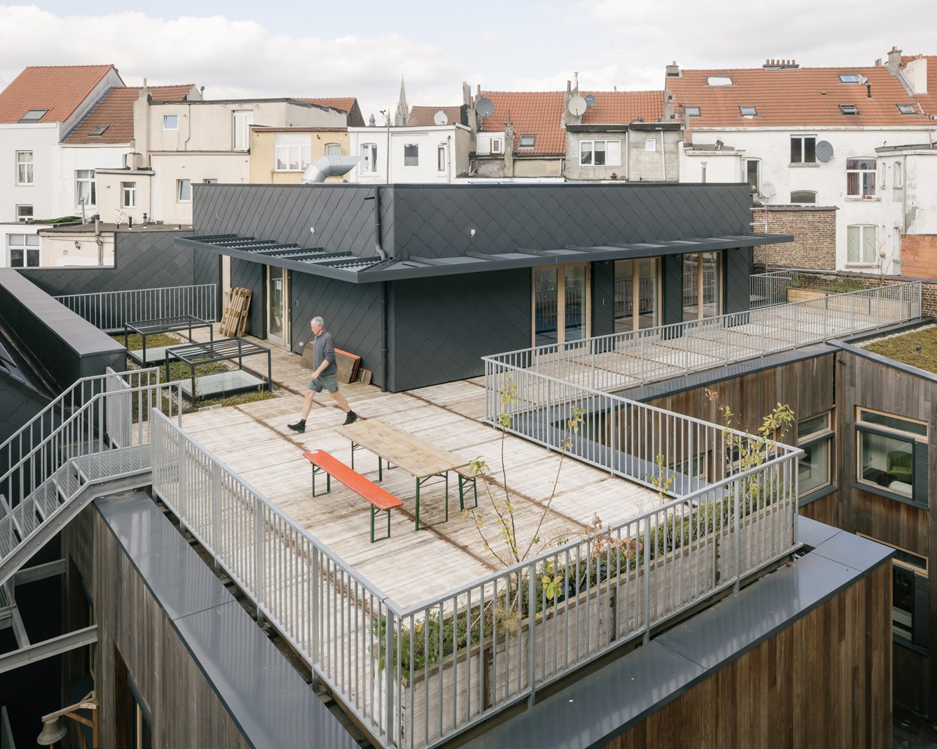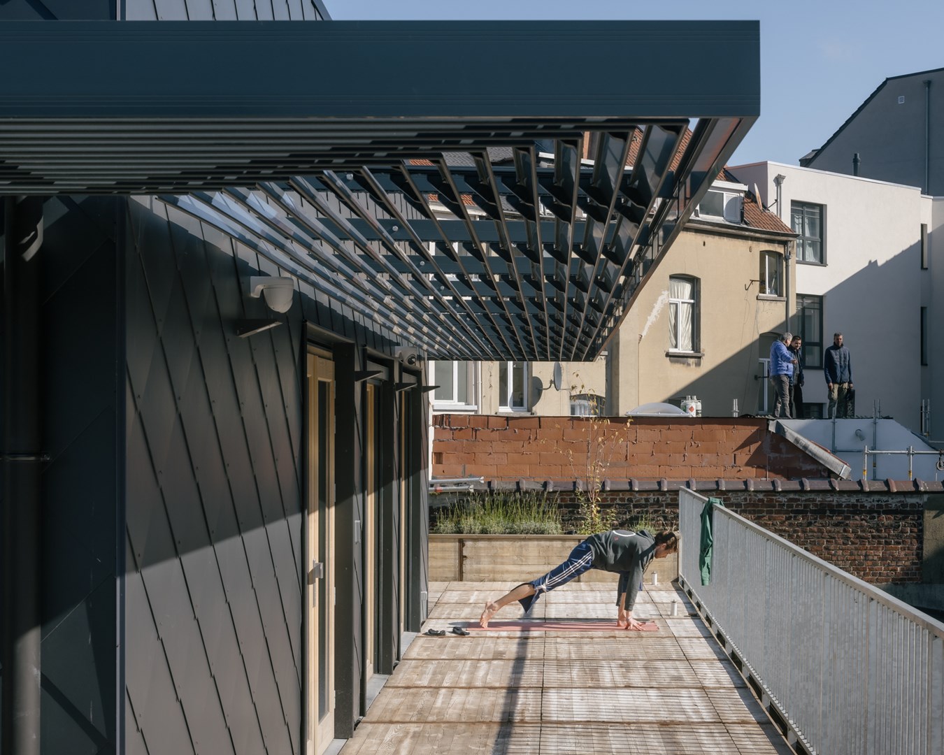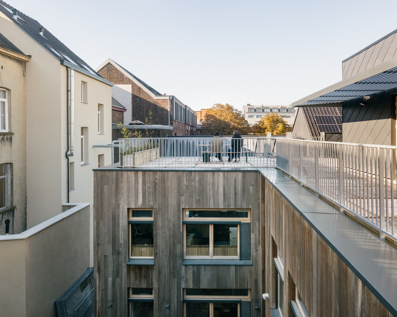 Luutzen: “Om de ecologische voetafdruk te minimaliseren zijn de gevels opgebouwd met duurzame en makkelijk demonteerbare en recupereerbare materialen zoals houten gevelbekleding en leien. Daarachter bevindt zich maar liefst 20cm rotswol, waardoor het gebouw een zeer lage energievraag heeft. De daken zijn ingericht als activiteitenzones en groendaken. Daardoor bekomen we een optimaal ruimtegebruik, dragen we bij aan een reductie van het stedelijke hitte-eiland effect, verhogende we de lokale biodiversiteit en capteren we fijnstof. Twee platte daken werden ingericht als groendak. Een ander dak doet dienst als terras en een derde dak is – samen met de schuine daken – uitgerust met zonnepanelen om de energie-efficiëntie te optimaliseren.”