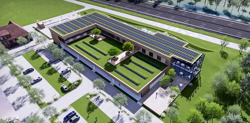 Het dak van het rechthoekige, lagere volume biedt ook plaats aan buitenruimte met terrassen, naast fotovoltaïsche panelen. Optimalisatie van de gebouwenschil en andere maatregelen resulteren in een bijna-energieneutraal gebouw.