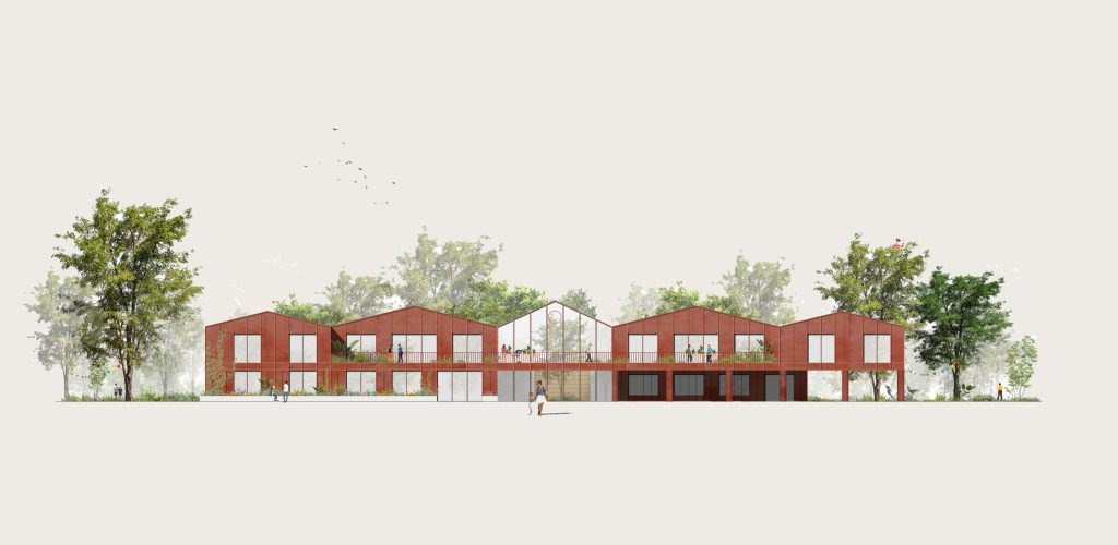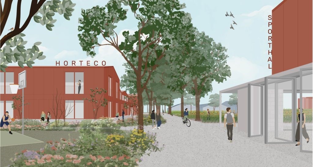Aan de straatzijde presenteert de Horteco-campus zich met een volledig nieuw gezicht. Het ontwerp, geïnspireerd op de bestaande serrestructuren, verbindt op harmonieuze wijze oude en nieuwe bouwstijlen. De historische gebouwen en typerende landbouwstructuren van de campus blijven zichtbaar aanwezig en versterken de identiteit van de school. Zo ontstaat een krachtig ensemble dat het erfgoed van de locatie eert en tegelijkertijd een hedendaagse uitstraling biedt.