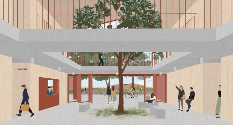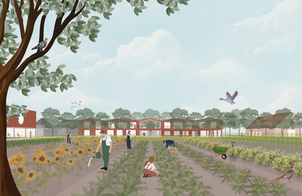 Een centraal atrium met grote raampartijen vormt het hart van het nieuwe schoolgebouw. Dit lichte en open ontwerp verbindt de lesruimtes met de omliggende velden en akkers, waardoor de sterke relatie tussen de school en haar natuurlijke omgeving voelbaar wordt. De openheid van het gebouw stimuleert interactie, samenwerking en een directe band met het landschap waarin landbouw en educatie elkaar versterken.