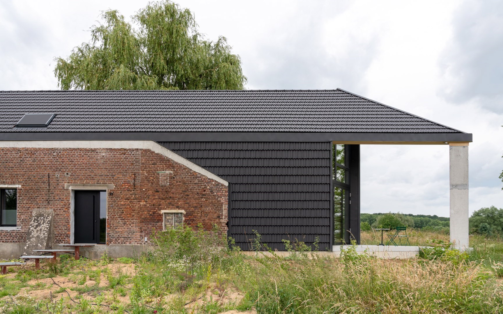 Het nieuwe volume werd volledig bekleed met zwarte pannen die mooi passen bij de gevelsteen van de oude hoeve. Het buitenschrijnwerk, geplaatst door het Zonhoofse Mondian, is van Oostenrijkse makelij en bestaat net als de keukenkasten en het parket in de woning uit larikshout, wat mooi aansluit bij de leempleister. Aan de buitenkant kreeg het schrijnwerk een gitzwarte aluminium afwerking, passend bij de gevelbekleding van het nieuwe volume.