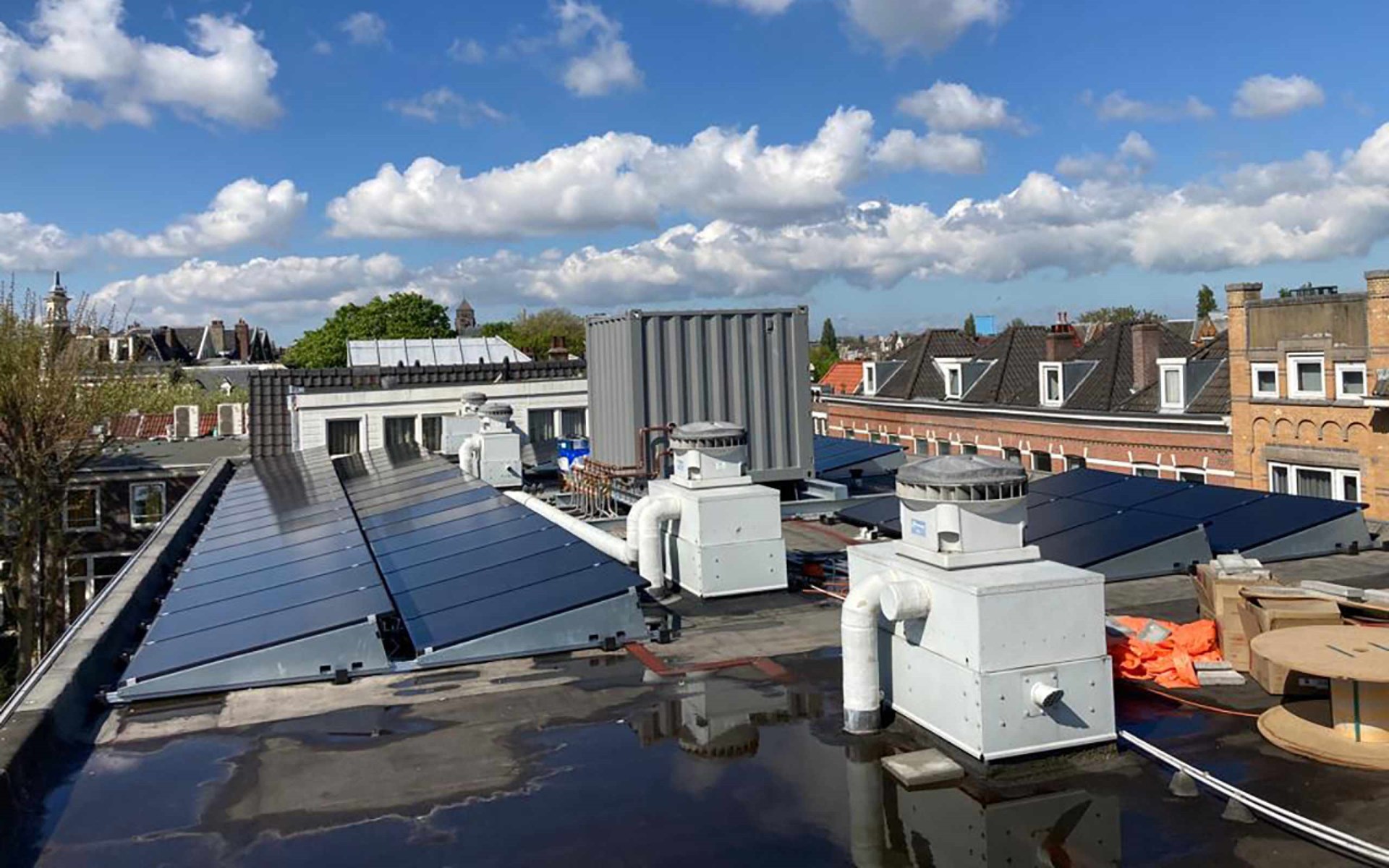 Voor acht portiekwoningen in de Schietbaanstraat in Rotterdam bedacht HRsolar Projects de Green Energy Rooftop Storage (GERS). Het dak van de woningen werd ingezet voor een combinatie van PVT-panelen en warmtepompen. Vorig jaar werd de installatie geplaatst. ,,Een veelbelovende ontwikkeling”, aldus Floris van ‘t Verlaat, product Product solutions Solutions manager Manager bij Caleffi. ,,Met weinig overlast kun je zo oudere woningen van het gas halen.”