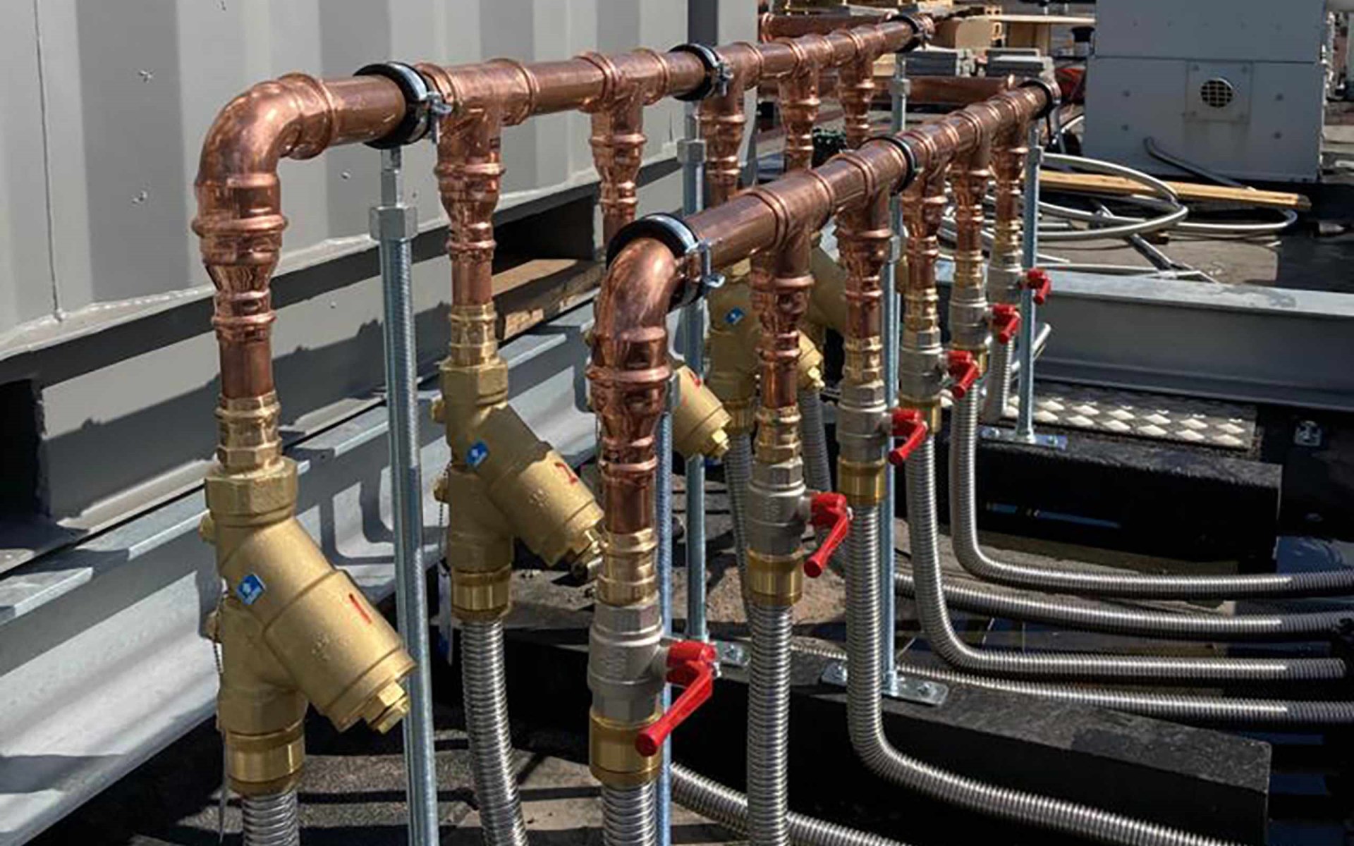 De installatie skid werd geprefabriceerd en uitgevoerd met twee warmtepompen, centrale CV-buffer en overige benodigde componenten. De 64 PVT-panelen functioneren als bron voor de warmtepompen. ,,De flow over de verschillende zones van de PVT-panelen wordt gebalanceerd door de Autoflow, de automatische debietbegrenzer van Caleffi. De Autoflow is ontworpen om een vooraf bepaald, constant debiet voor water te leveren, ongeacht de drukverschillen. Het systeem houdt een stabiel debiet als het drukverlies binnen de gespecificeerde grenzen blijft. Het voorkomt schade en biedt bescherming voor pompen, filters en stelsels van watervoorziening die gevoelig zijn voor drukschommelingen. Daarnaast scheelt het de installateur werk, ter plaatse hoeft er niets in- of nageregeld te worden. Daarnaast weet je zeker dat het debiet goed is.”