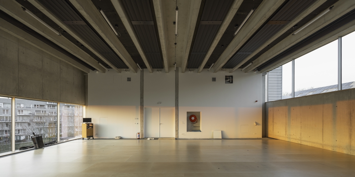 Voor P.A.R.T.S. werden vier nieuwe dansstudio’s toegevoegd, deels aansluitend bij de bestaande Rosas Performance Space. Drie studio’s werden verticaal gestapeld, wat resulteert in een compacte footprint en maximaal behoud van open ruimte. De hoogste studio, met een vrije hoogte van zes meter, biedt royale proporties en grote raampartijen met uitzicht op de tuin en de Brusselse skyline. Daglicht en zicht worden expliciet ingezet als onderdeel van het creatieve klimaat.