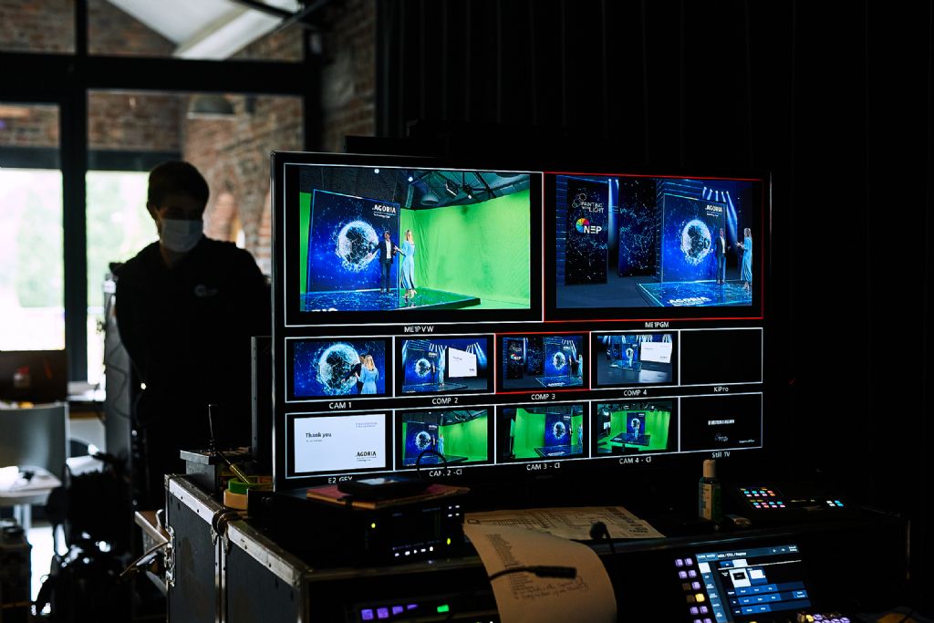 De blikvanger van de Virtual Event Studio is een fysieke en hogeresolutie LED-muur van drie op drie meter. De presentator staat zo voor een virtuele achtergrond van hoge kwaliteit, waarbij een volledige videovloer zorgt voor een coherente visuele dynamiek. Alle andere schermen zijn virtueel, met enkele kleine fysieke schermen om inhoud en omgeving te monitoren, alsook interactie met het publiek te accomoderen.