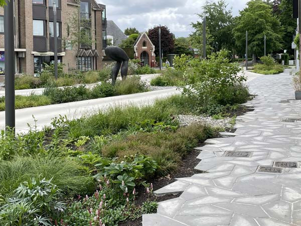 De Schooldreef in Oostkamp is in 2025 uitgeroepen tot beste tuinstraat van Vlaanderen: groen, klimaatbestendig en leefbaar. Een belangrijk onderdeel van het winnende ontwerp van studiebureau Lobelle is de verharding met parksteen en parksteentje. Deze vijfhoekige waterpasserende steen van Aquaflow werd oorspronkelijk ontwikkeld voor toepassing op waterbergende funderingen, maar wordt inmiddels ook toegepast op klassieke wegfunderingen.