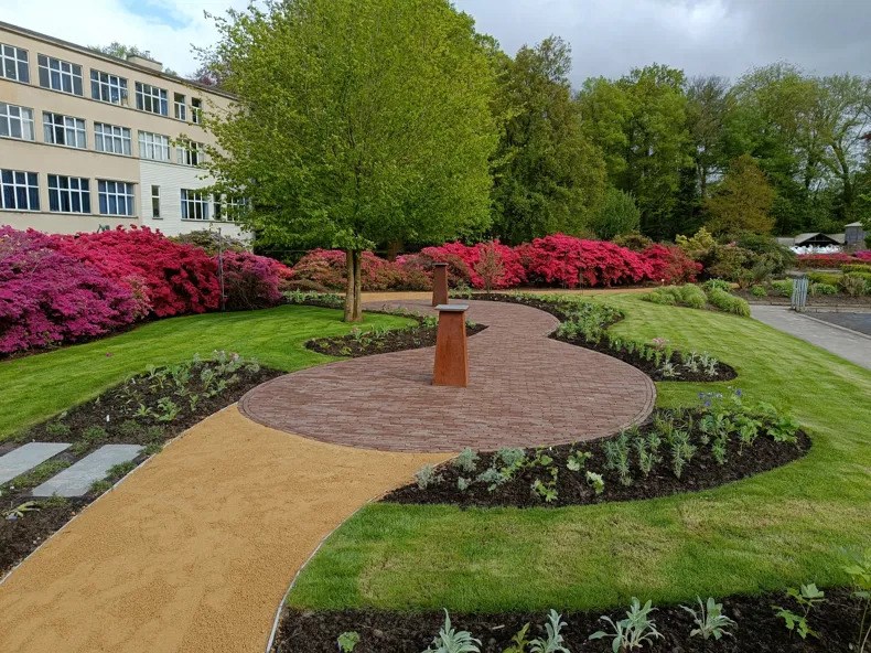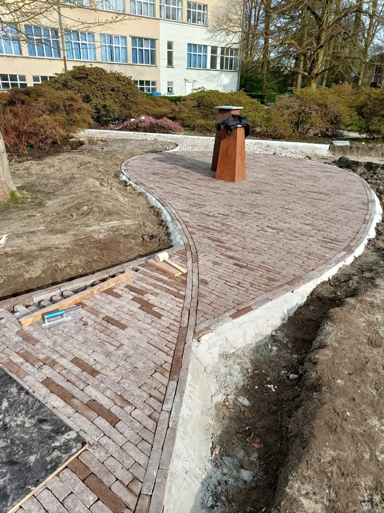 De verharding in de Passietuin is speels en vloeiend ontworpen, wat een mooi contrast biedt met de strakke lijnen van de aangrenzende Droomtuin. Dit ontwerp benadrukt de esthetische aantrekkingskracht van de tuin en maakt het een uitnodigende ruimte voor zowel leerlingen als bezoekers.