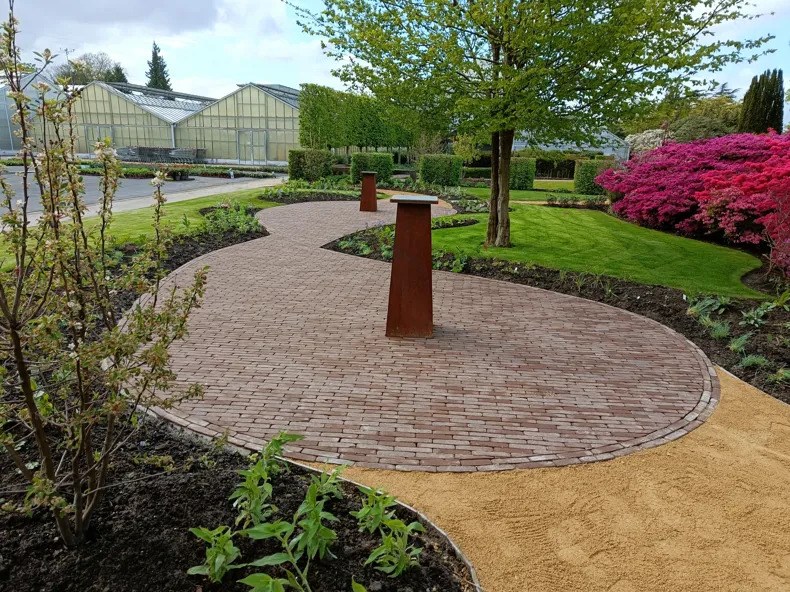Centraal in het project stond de aanleg van een verbluffende bloementuin, deels verhard met ecologisch geoptimaliseerde kleiklinkers van Steenbakkerij Vande Moortel. Deze verharding maakt gebruik van het H2O Clay Paving Sand voor waterdoorlatende bestrating, waardoor regenwater natuurlijk kan infiltreren in de ondergrond. Gekozen is voor de Septima kleiklinker in kastanje, die niet alleen een lagere CO2-uitstoot heeft, maar ook minder materiaal en energie vereist dan traditionele gebakken straatstenen.